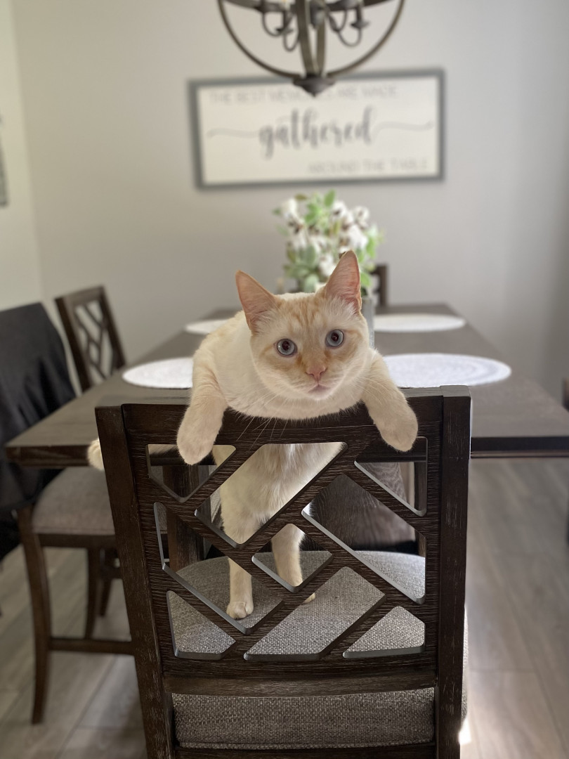 He is very protective of his 2 female siblings & loves them so much. He’s a gentle giant until he needs to NOT be. His 2 sisters just love him. He’s a very persistent communicator. He will tell you a story until YOU understand it. He is a very patient cat, loving and very playful. He makes you smile by just showing up to welcome you. He is the gentle giant of his home. We have never had a cat like Milo. He is a very special boy.