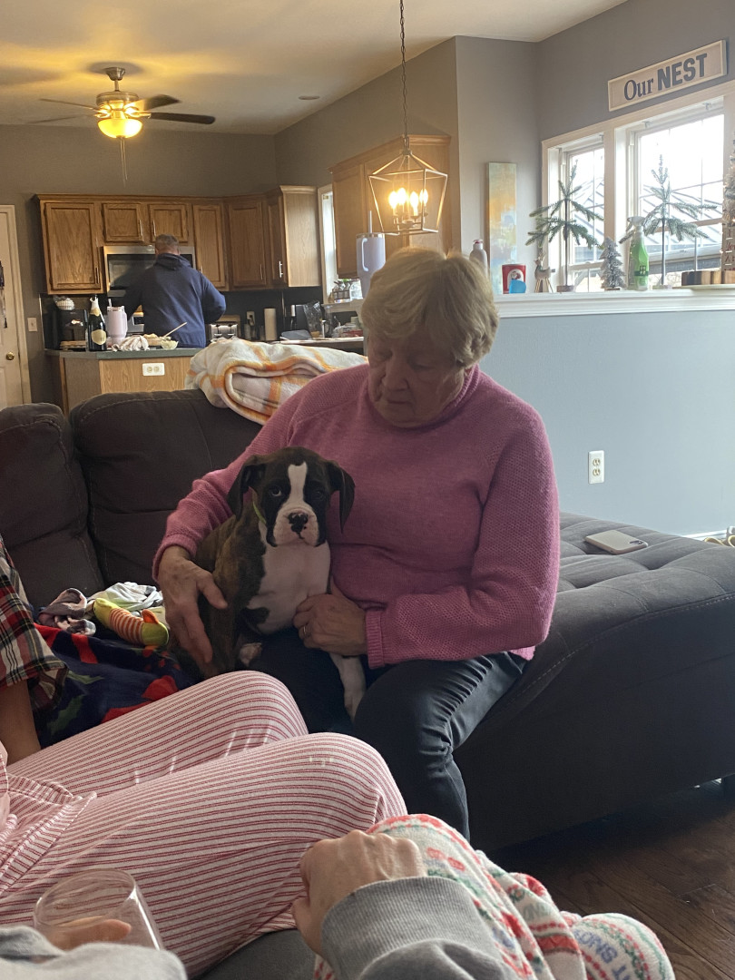 A snuggle Buddy. Milo’s a boxer pup who loves to watch TV and sprawl out .