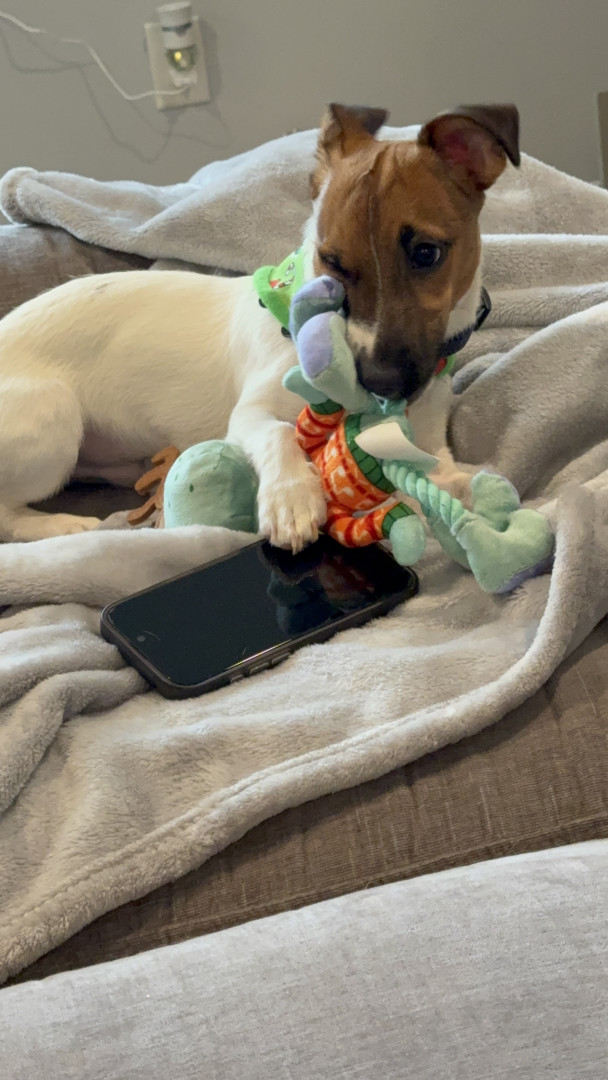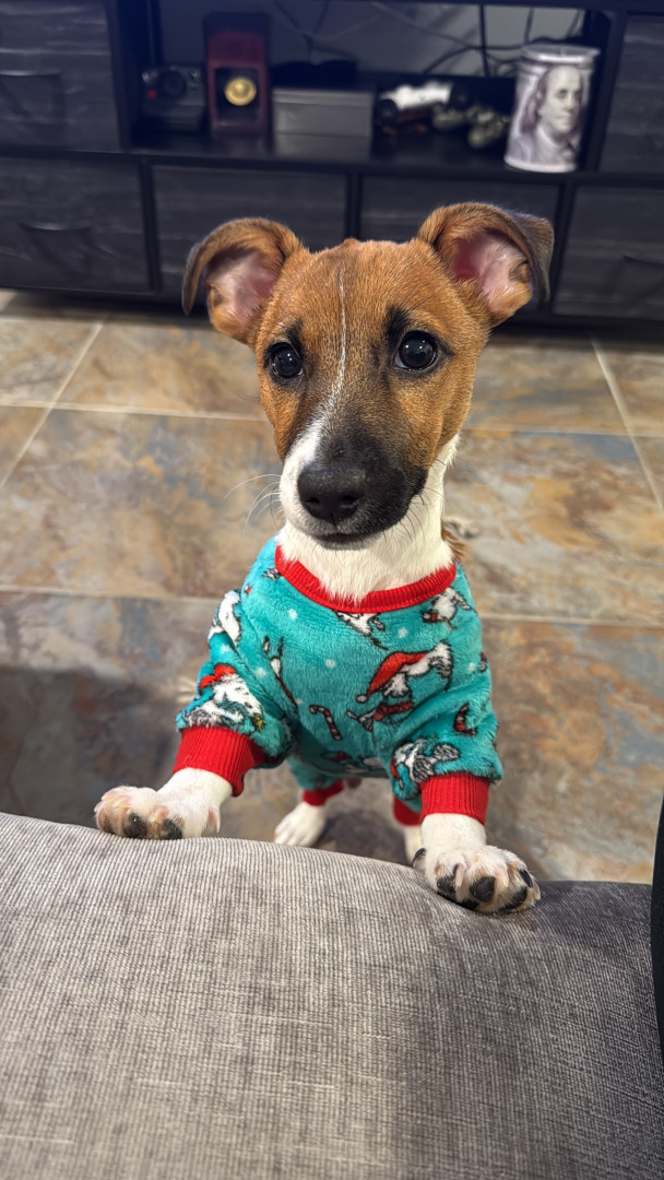Milo has many toys, but there is one specific toy that he loves and it is because it makes a lot of noise, he loves to make it play all over the house, this toy is like a Santa Claus but in the shape of a Christmas cane.