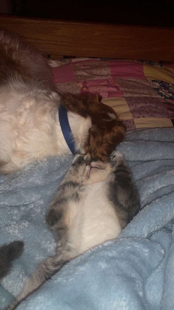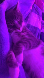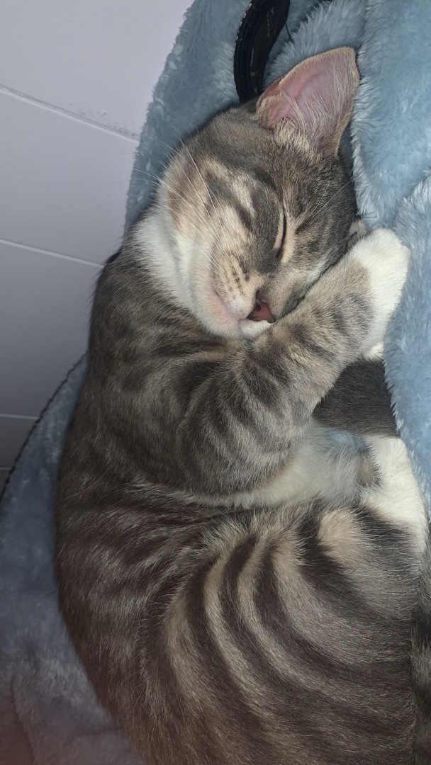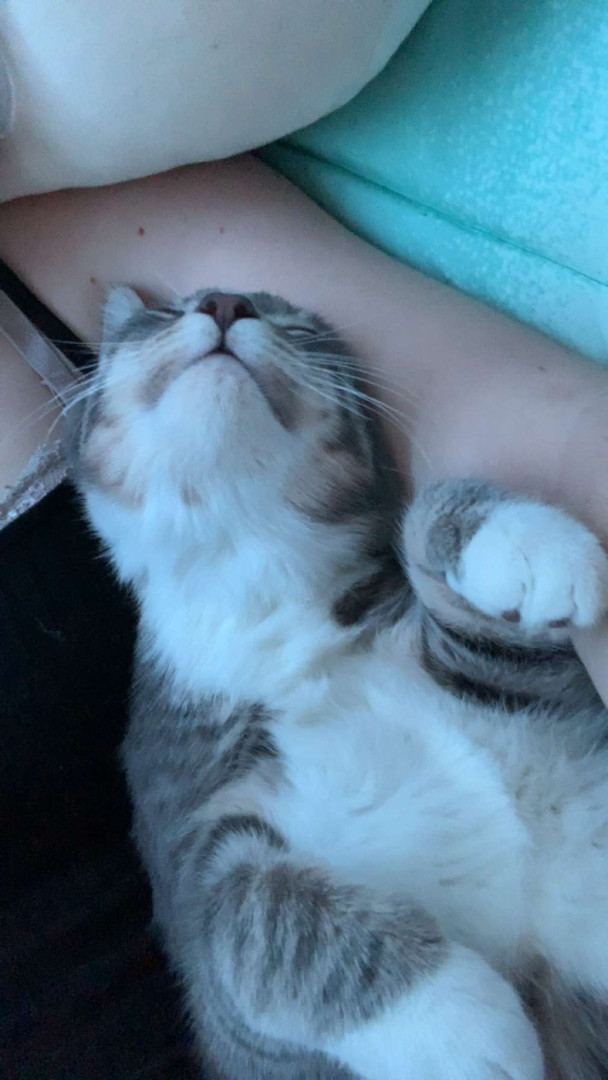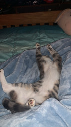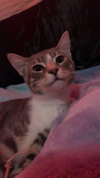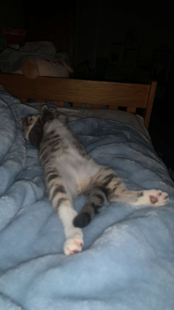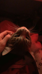 he developed a freckle on his nose, he often sleeps with his arms tucked under him or on his back like a starfish. he can jump onto very high places. he loves eating dog food. the white on his chest looks like a big scarf.