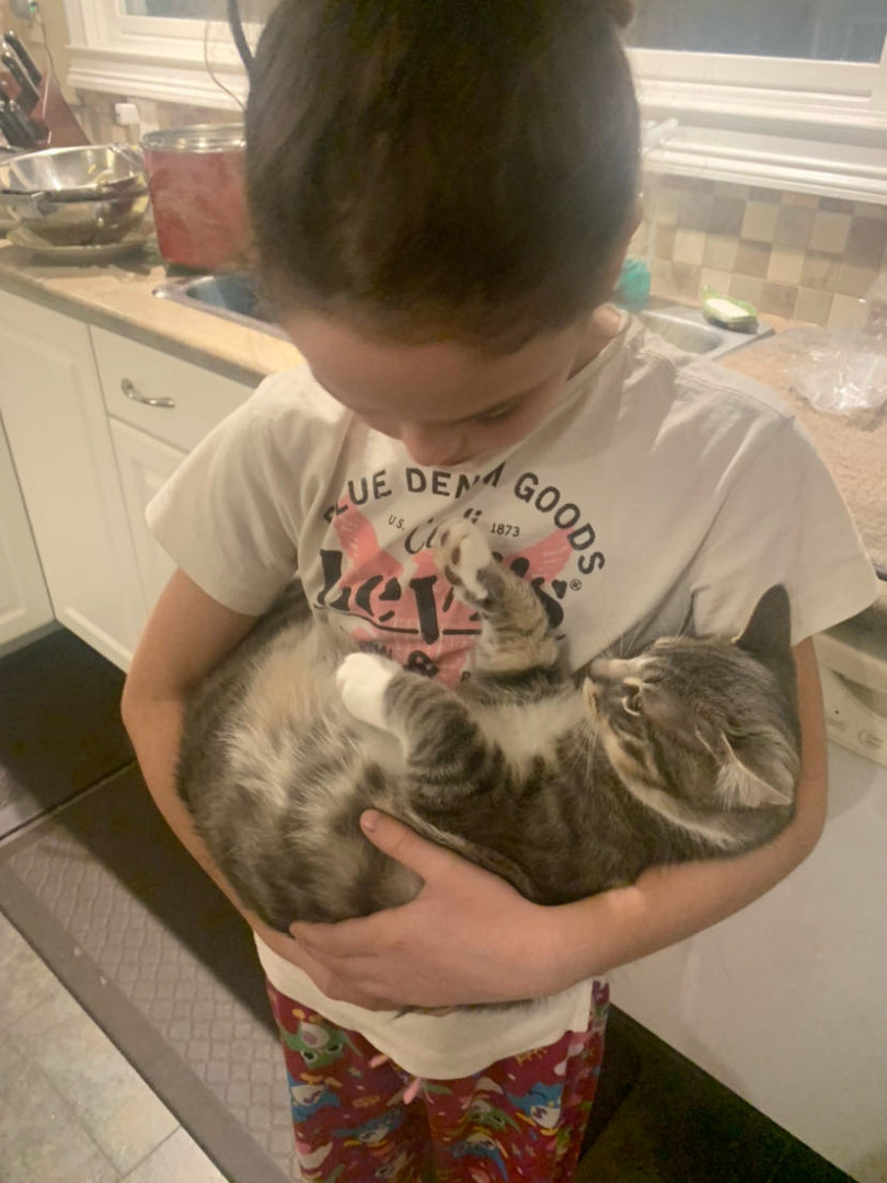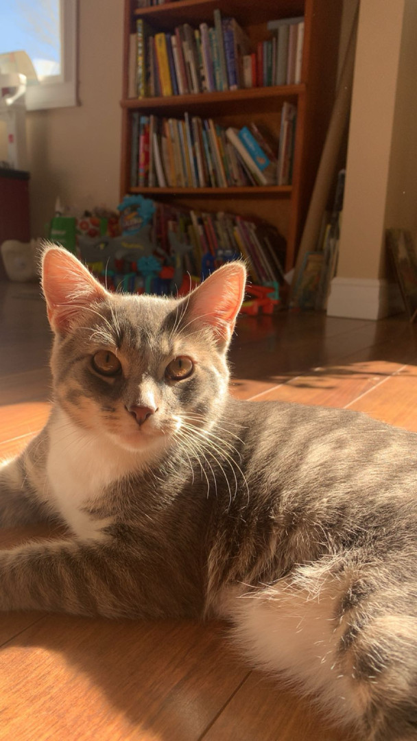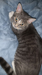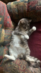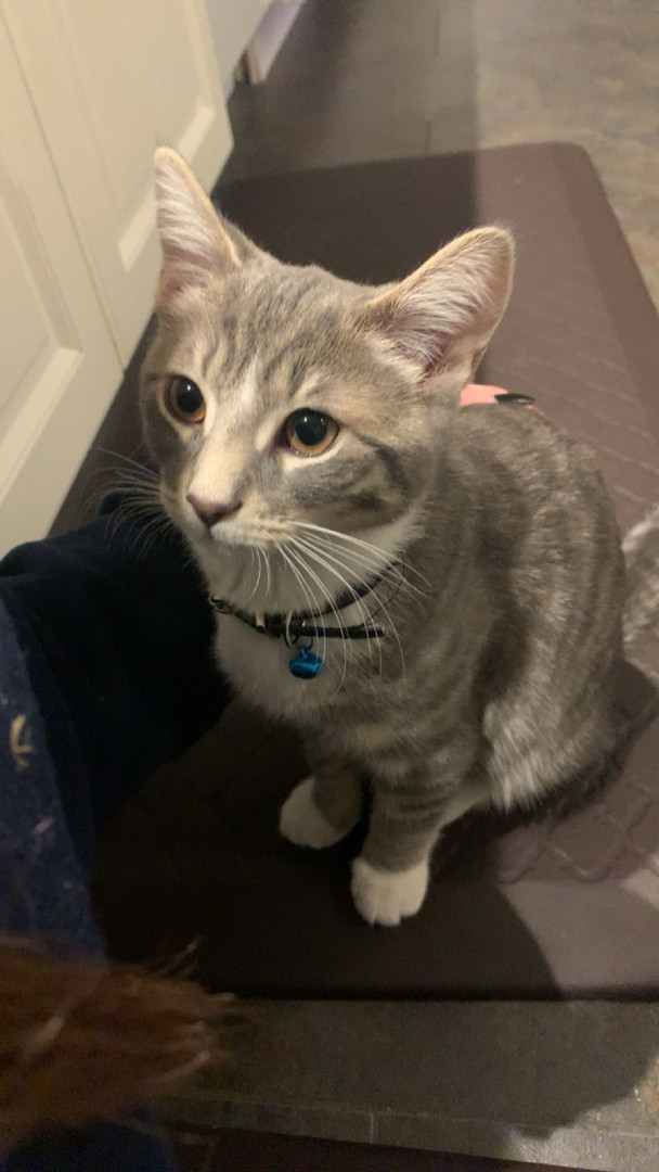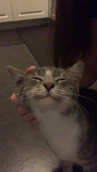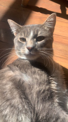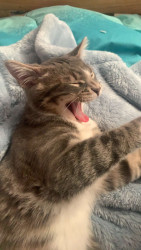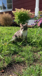 loves food, very curious, enjoys outside a lot, very clingy, very loud meow when he wants something, very playful and loves to nibble toes.