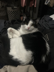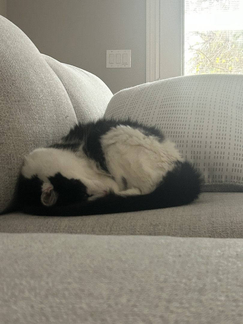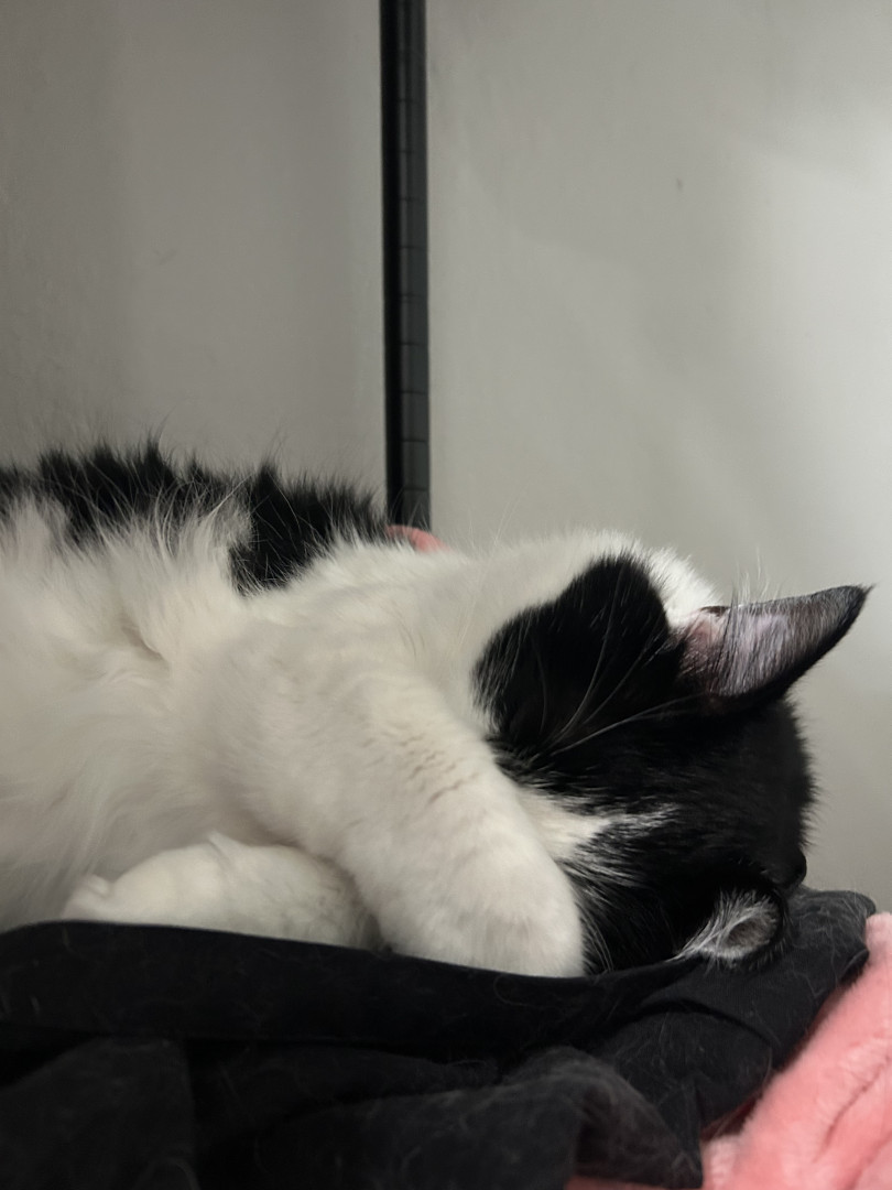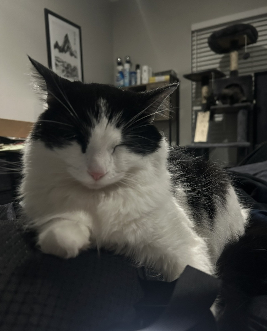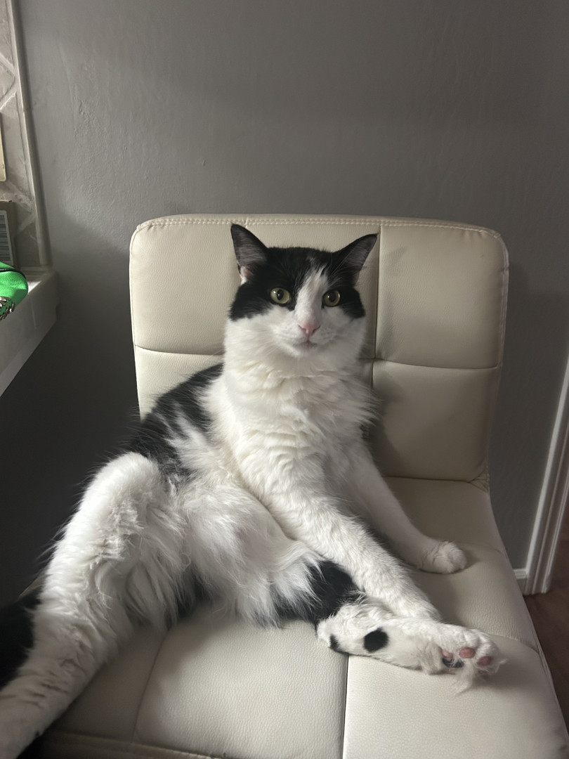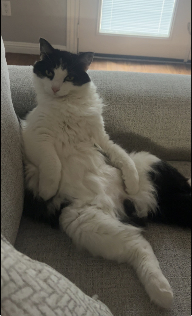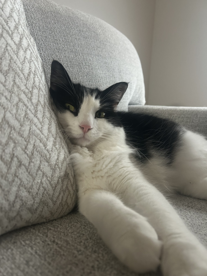 Milo is a chatty cuddle bug who loves affection, random zoomies, and lounging in the silliest ways.