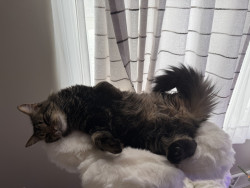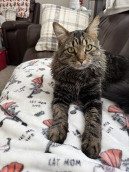 Milo is a gentle giant. He is very gentle trying to play with his brothers. He had never been around other cats, but welcomed them with open paws. He is very laid back. He greets people at the door, and doesn’t run from the vacuum. He did hear a snowplow go but and did the first time I heard him growl lol. Nothing else seems to bother him. And he loves bird watching!