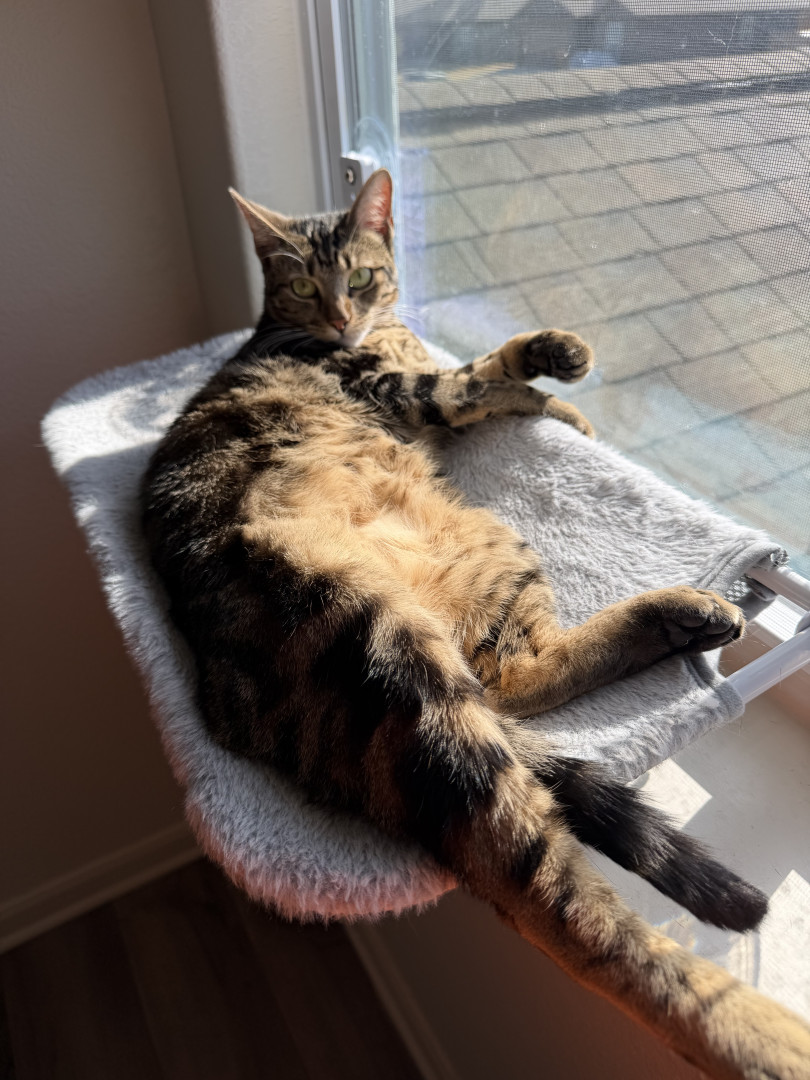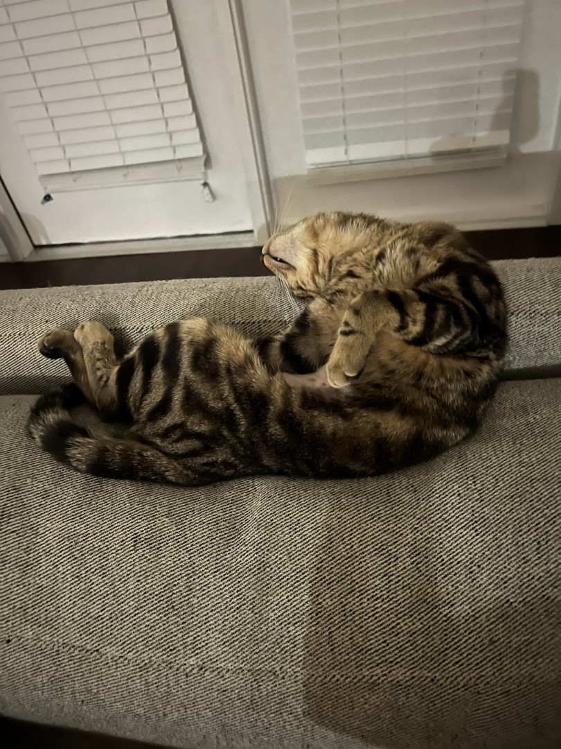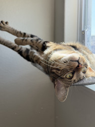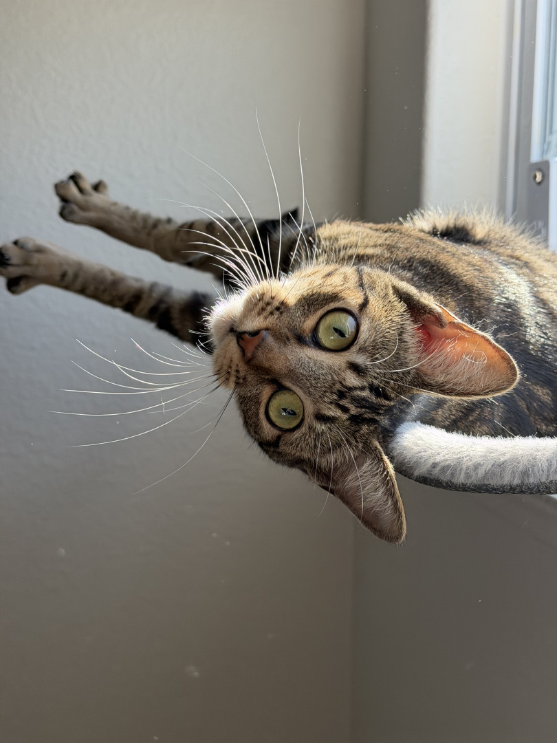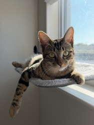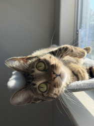 Milo’s most unique quality is her personality. She loves to play hide-and-seek, fetches a ball, and will run off to hide just so she can jump out and surprise me—she makes me laugh constantly. She even tries to sneak up on and scare her cat sisters. On top of that, she can jump incredibly high, twisting mid air sometimes throwing in a little flip jump for fun.