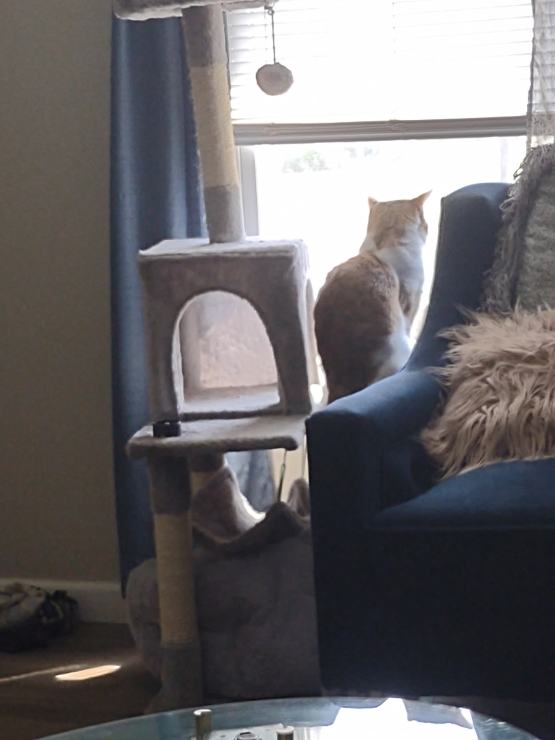 He's a American short hair for one, and"proud to be an American." He looks so stunning, it's almost majestic. If we won, we could move to a much better place before his Mommy's life altering surgery. I have to have a 2 day spinal fusion. Where we are now is not set up for this. So, he would have a much nicer place to move around and run around.