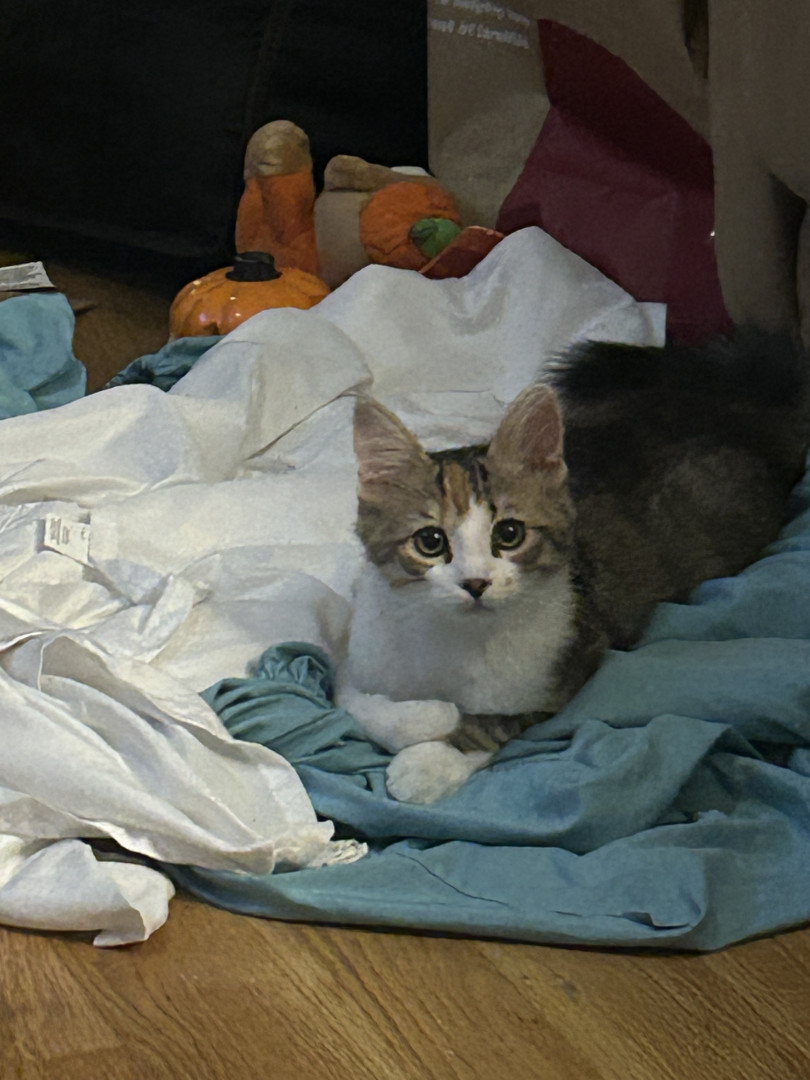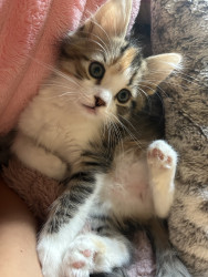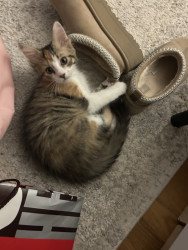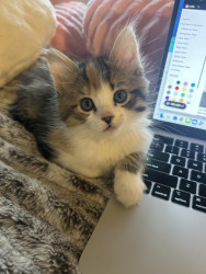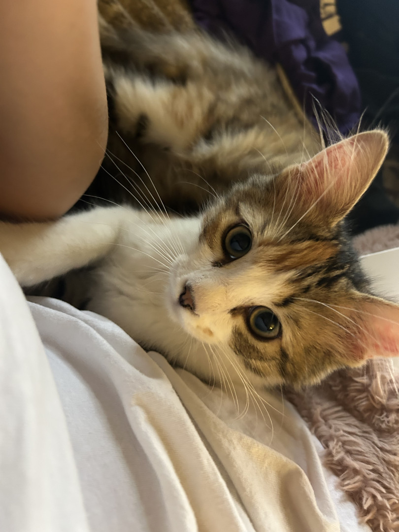 Minnie is the sweetest , clingy kitty i’ve ever met. Her eyes show a warm, tender love when she looks at you. She has spunk but is adorable.