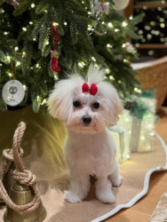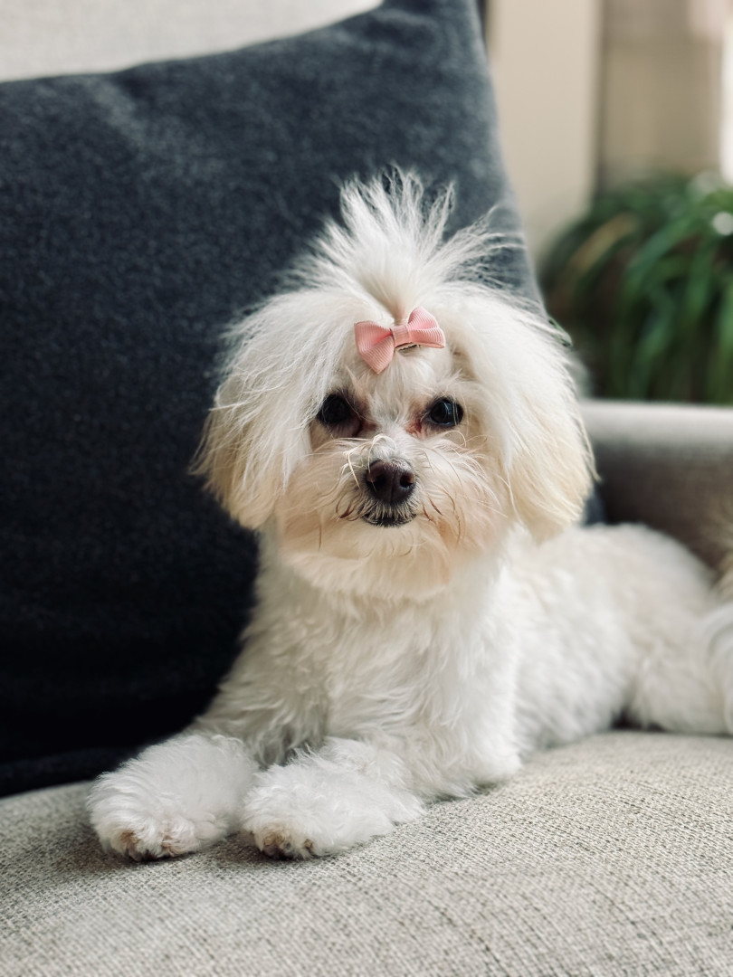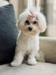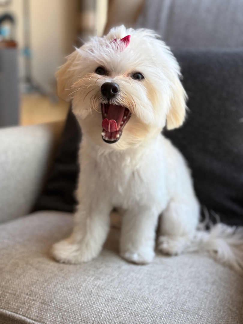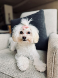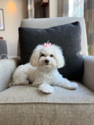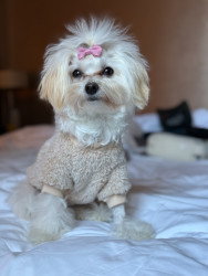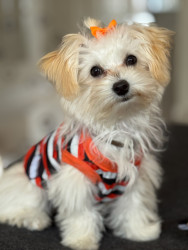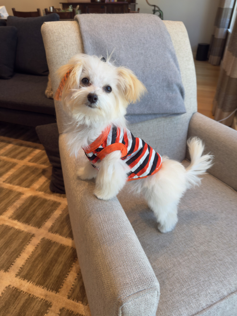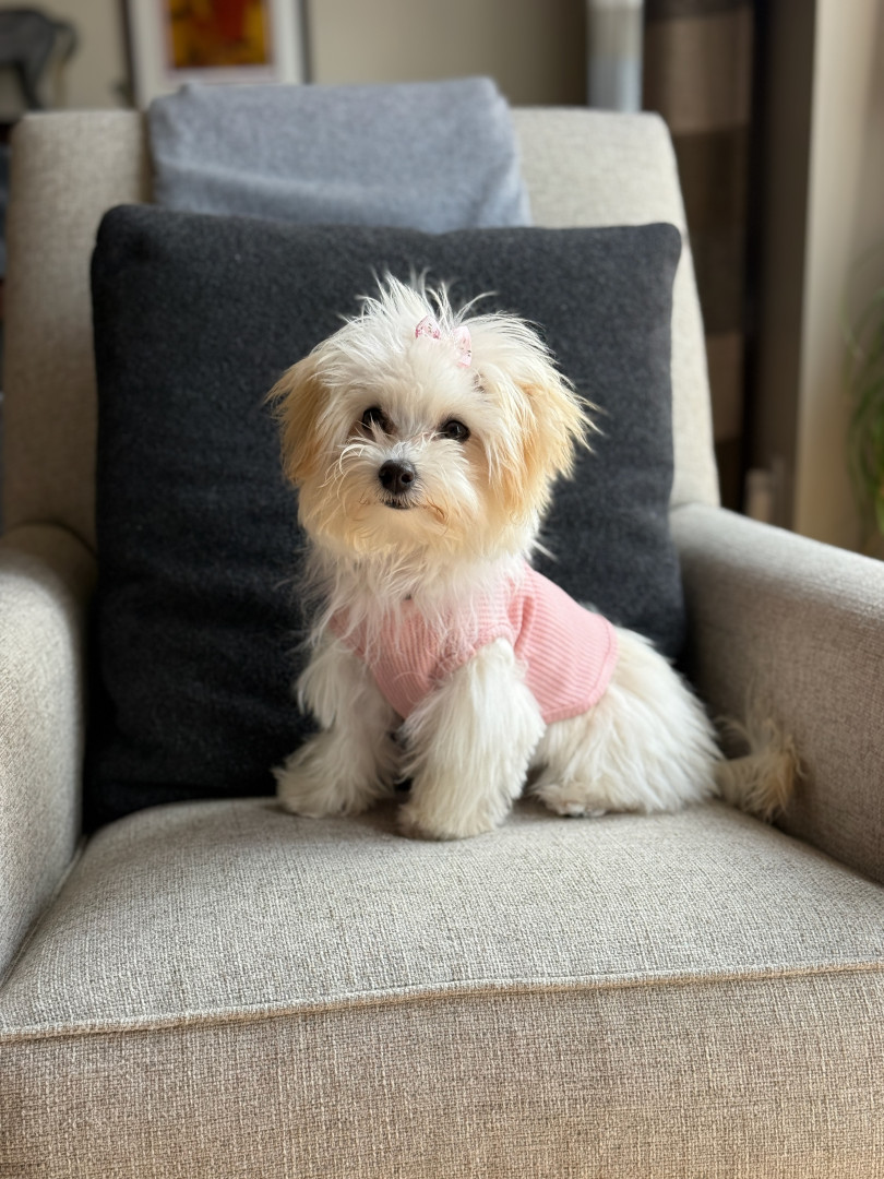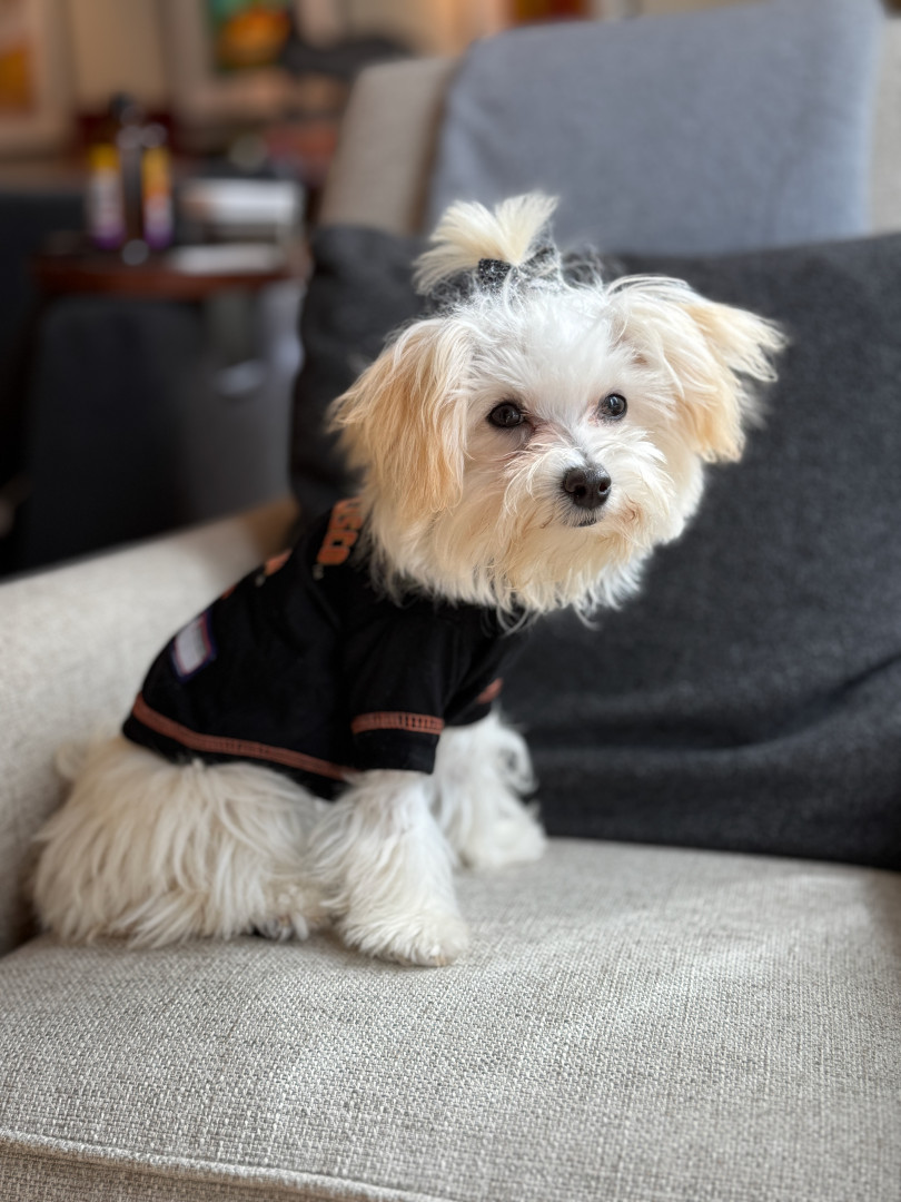 Jules is a furry genius in a Maltipoo body! Her most unique quality? She’s scary smart—like, “learns new tricks in hours” smart. Sit, down, stay? Easy. Ring the bell to go potty? Mastered. (Though I suspect her real motive is the treat she gets for doing her business.) Her intelligence is equal parts impressive and slightly suspicious—she’s definitely plotting something behind those sweet, innocent eyes!