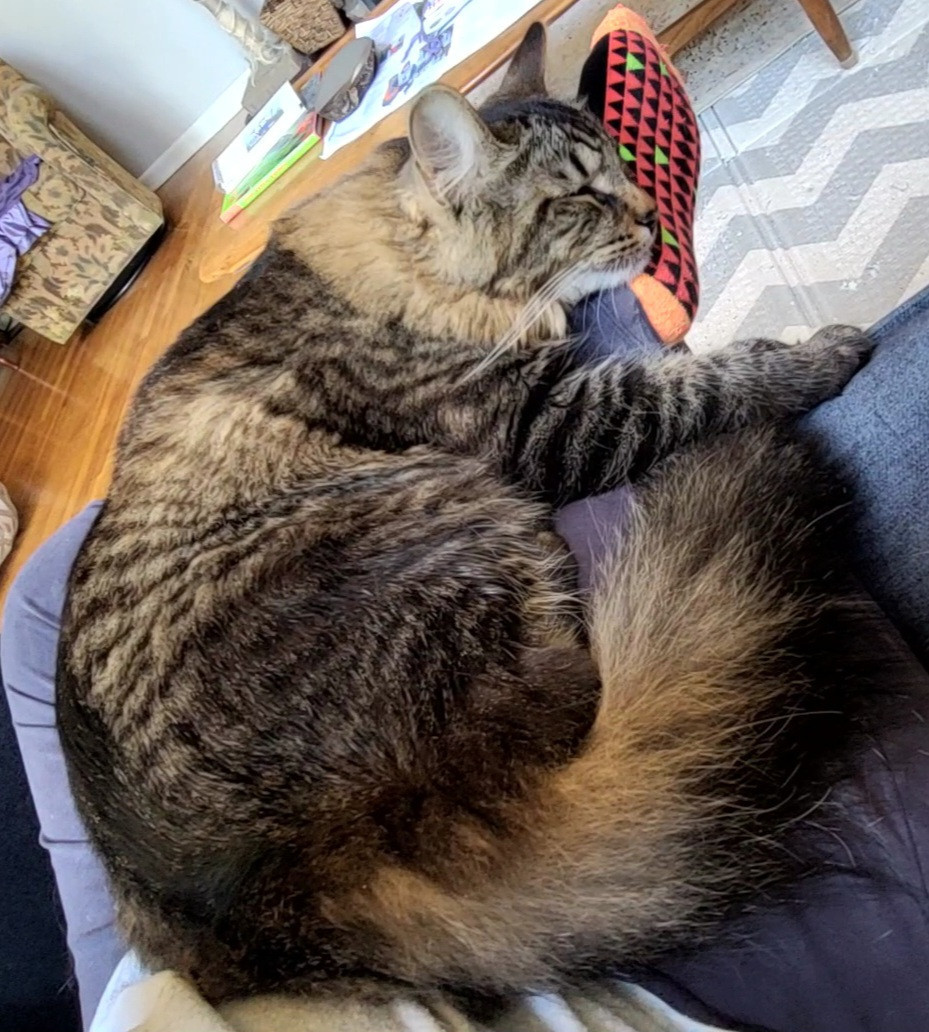 His name says it well, but he is also very sweet and loving. He is very playful and loved to watch cat TV. He was a kitten of a feral cat.