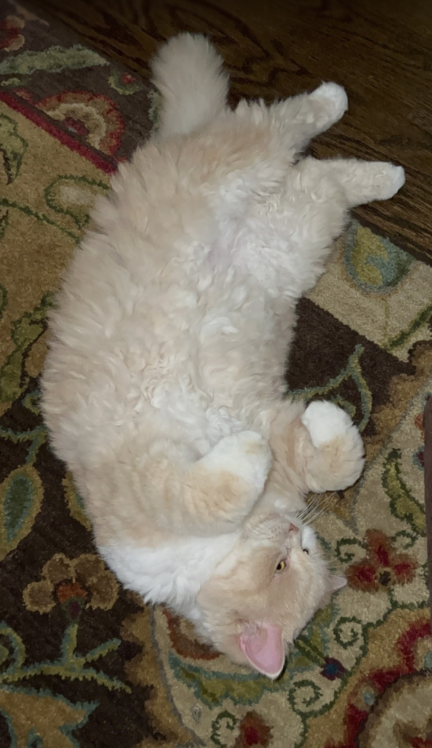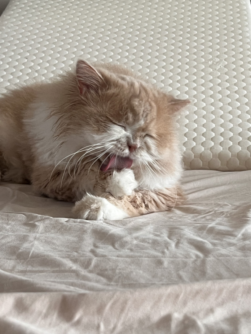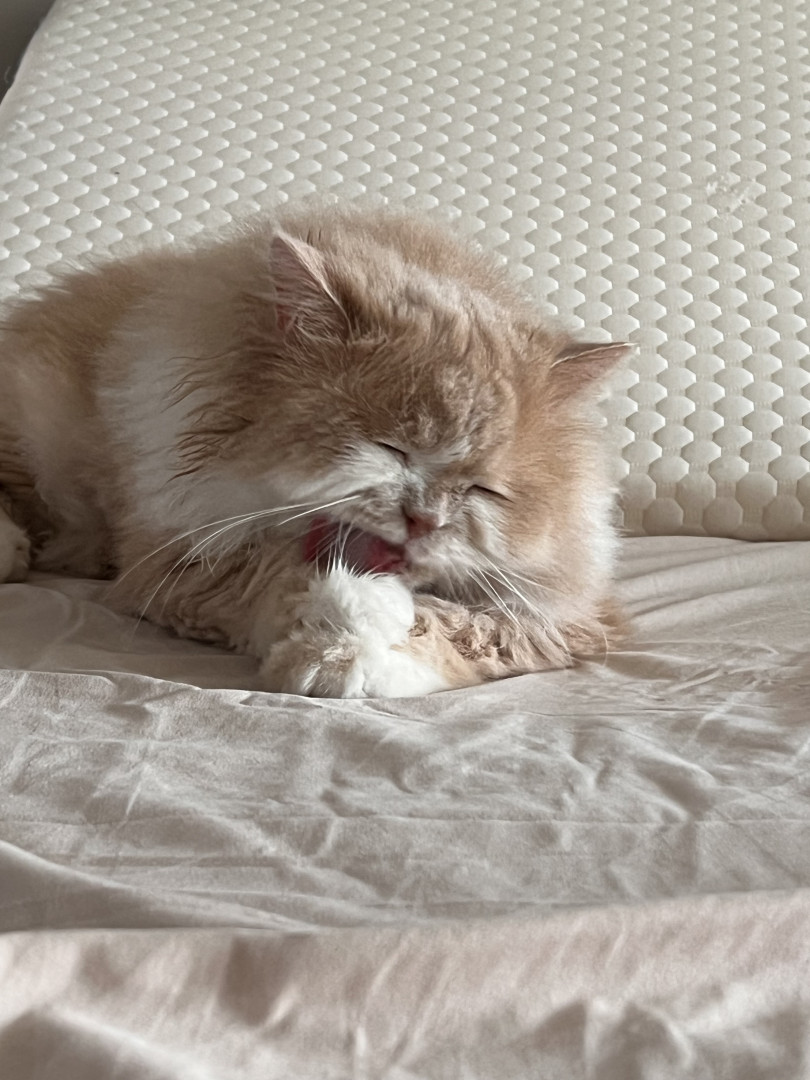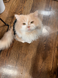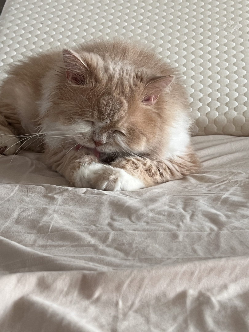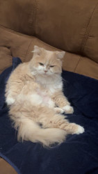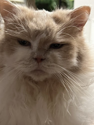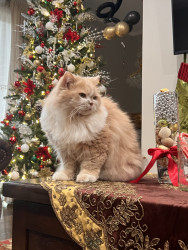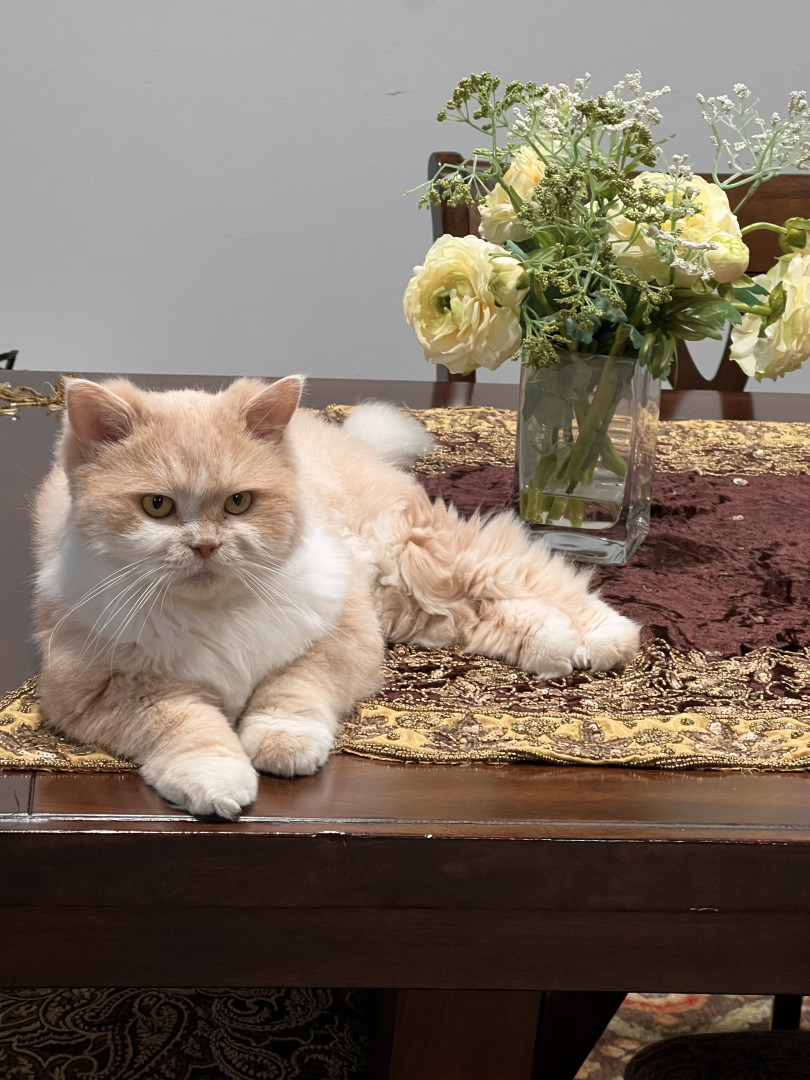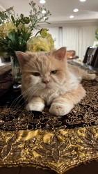 Mishmish’s unique quality is the rare blend of calm elegance and playful softness. With a naturally regal posture and expressive, thoughtful eyes, Mishmish carries a quiet confidence that feels soothing to be around. Yet in moments, that dignity melts into pure fluff—rolling over, stretching out, and inviting comfort and trust. Mishmish communicates love without noise, using gentle body language and presence. Wrapped in cloud-like apricot-and-cream fur, Mishmish radiates warmth, serenity.