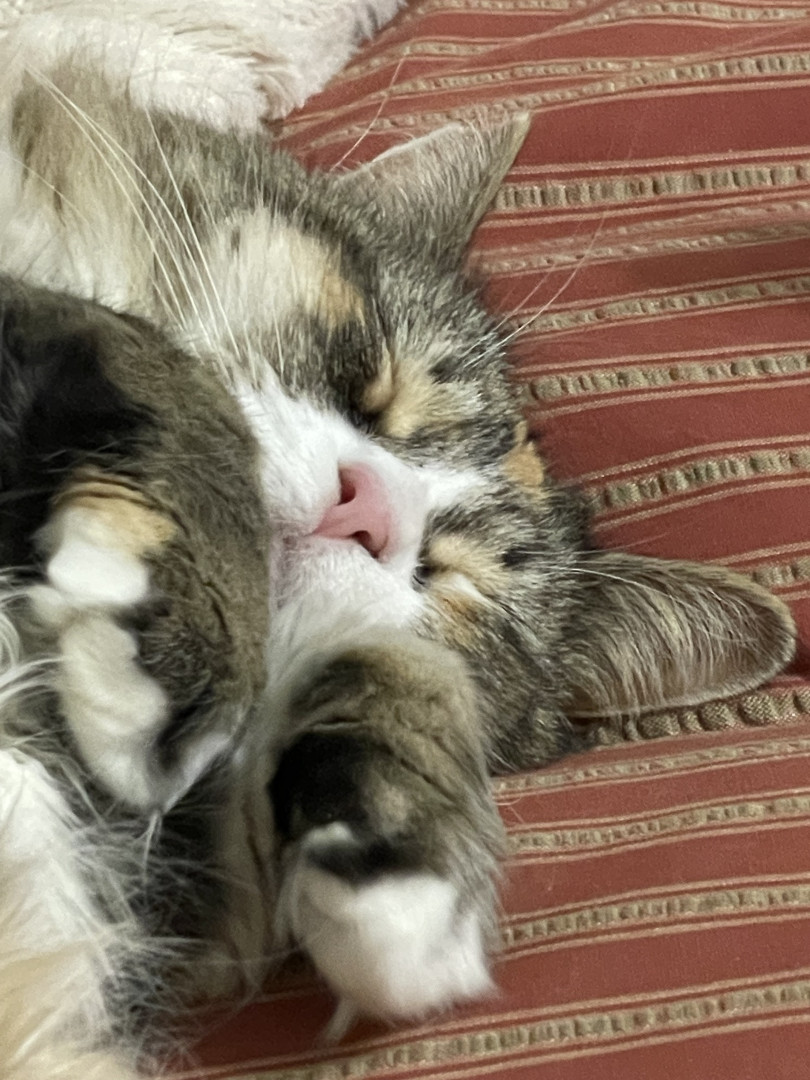 Miss Eleanor prefers people over other animals despite her history. Someone surrendered El as a found cat to my local shelter. She became moody after awhile. Animal Control decided it would be best to spay Eleanor, tip her ear, & adopt her out as a barn cat. No one knew until her spay that El was front declawed. So now El’s adoption options really narrowed. I had just lost my cat to cancer and thought El and I could help one another. The rest is history.