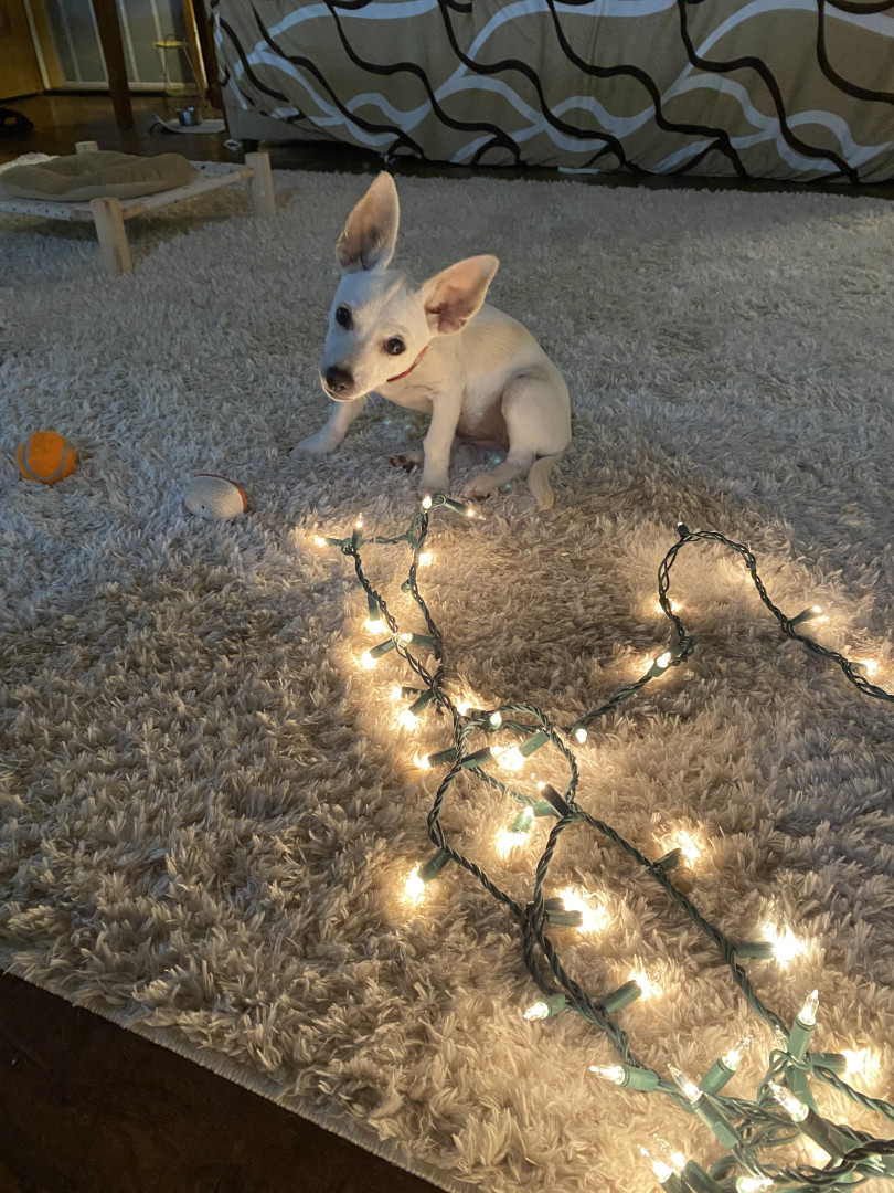Mochi is quite but will jump into guard mode when strangers, wild hogs and other dogs come around. She knows when mama is getting ready to go somewhere making her sad eyes. She’s smart, she learned to use the doggy door to go potty all by herself , she knows how to knock on the front door if she wants to go out or come in front the front house door. She’s white like snow.