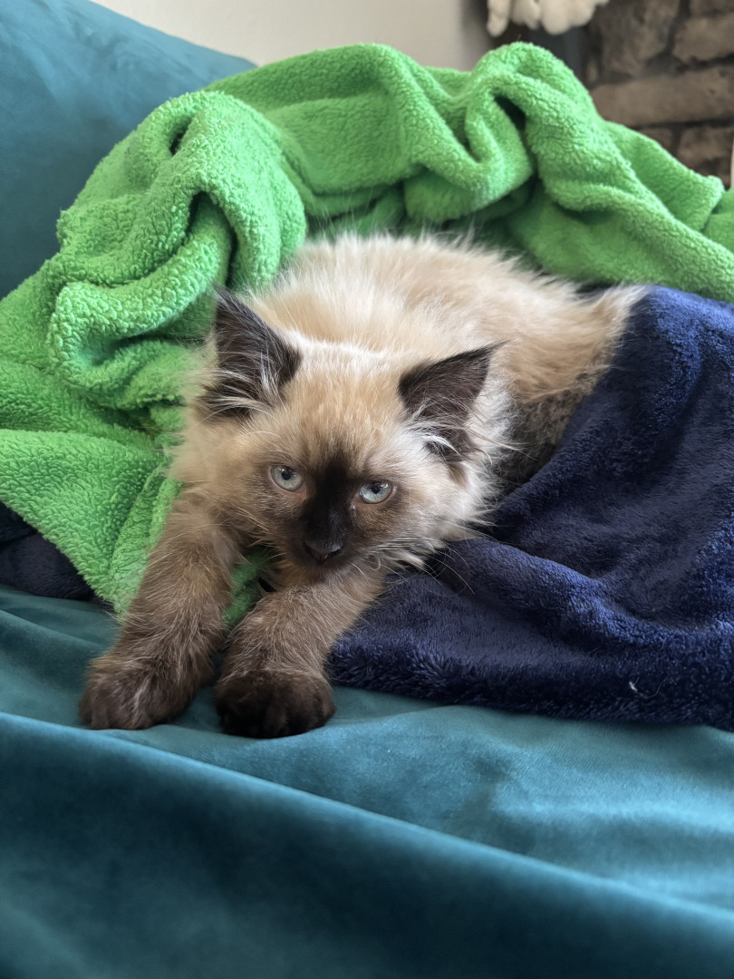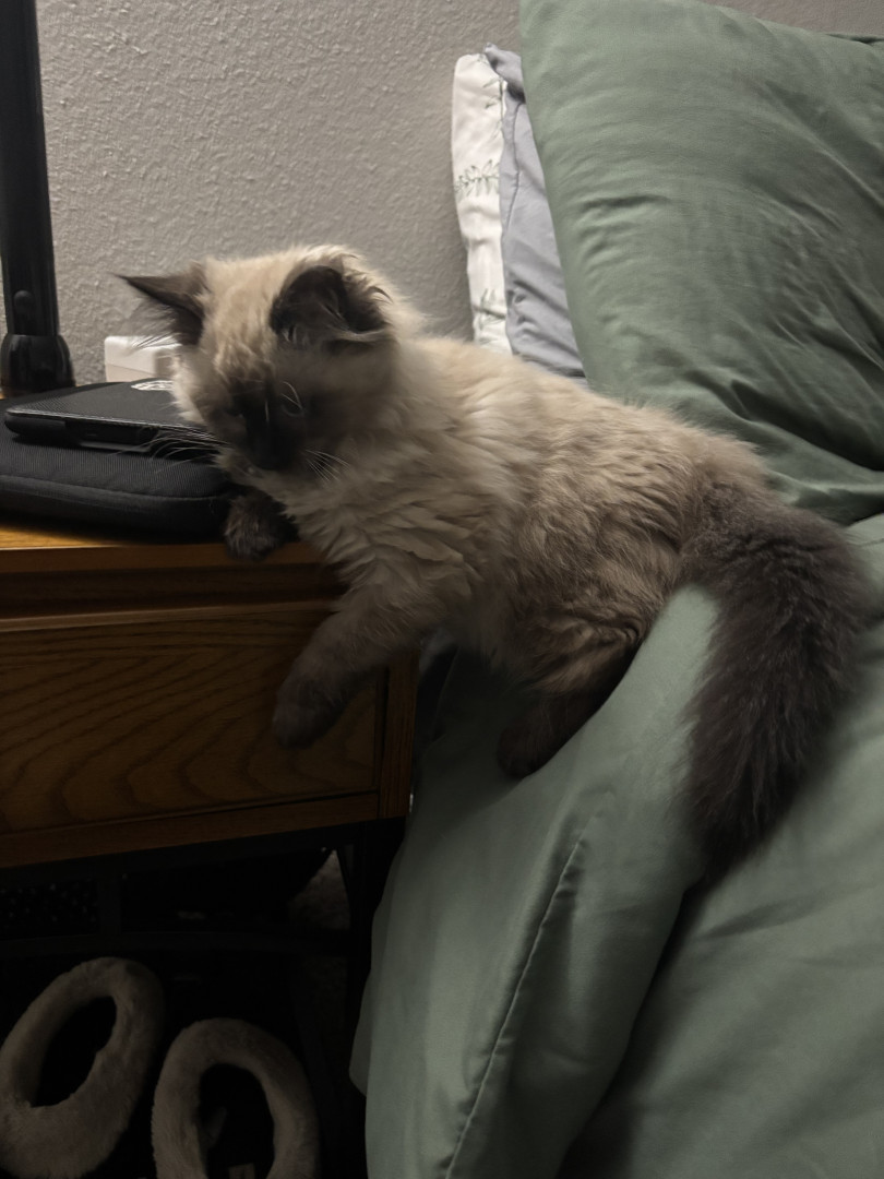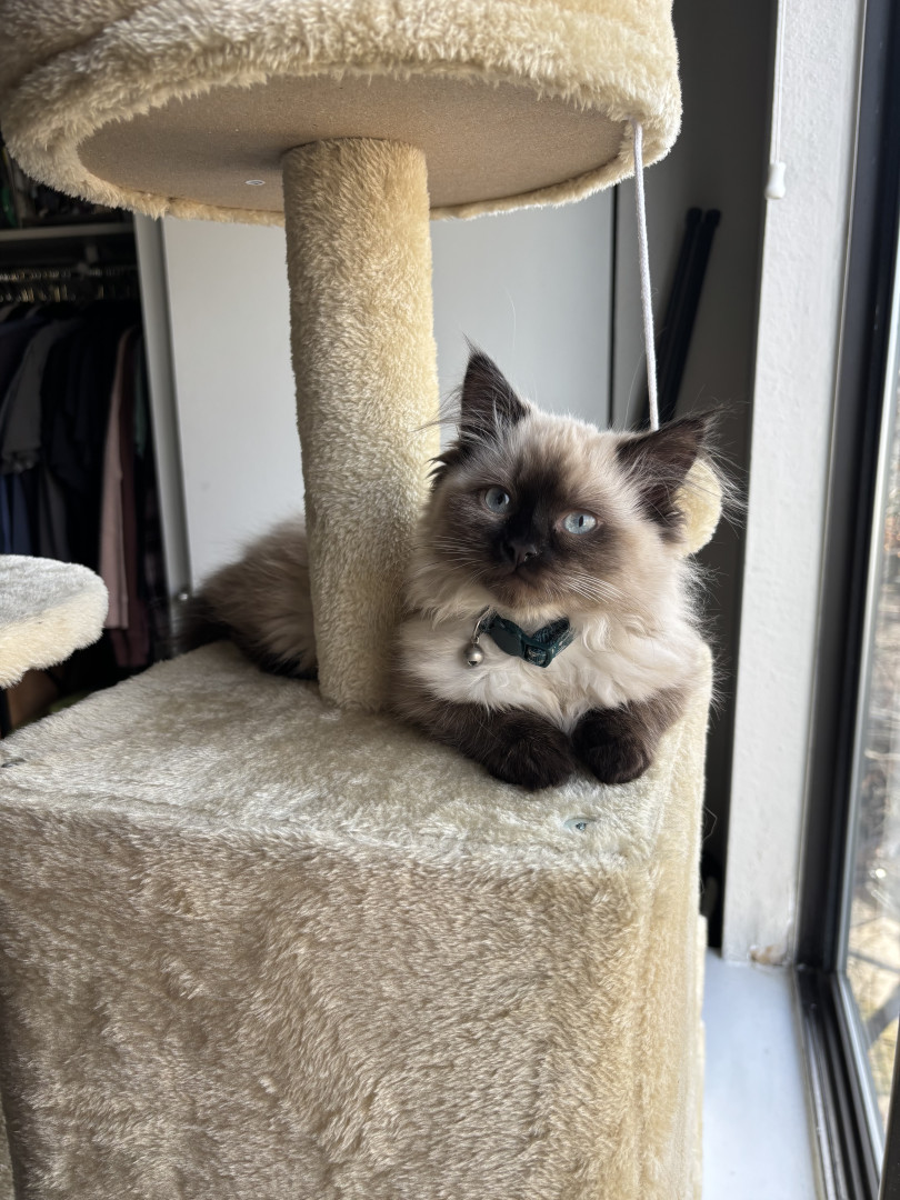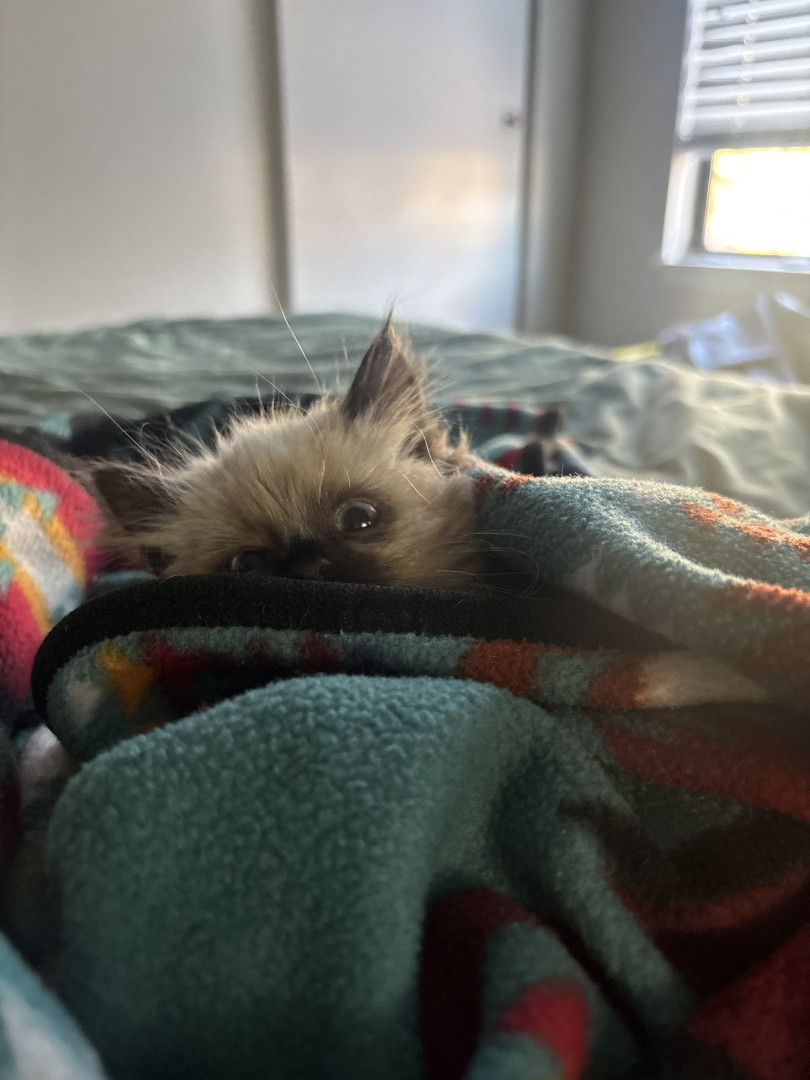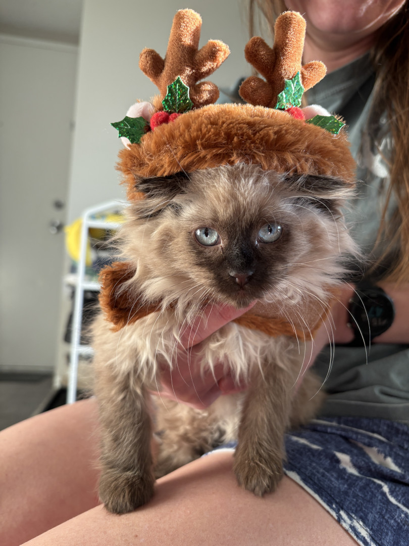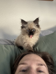 She's a rags to riches story. I was going to a friend of a friend's house and he was calling them to confirm the address, and while he was on the phone I heard a little meow from behind me. And there was this little raggedy (and stinky) kitten running as fast as her tiny legs could take her towards me. She was only 1 pound, but she had a big personality. Now she is the queen of the house. She provides endless entertainment and joy to everyone who meets her.