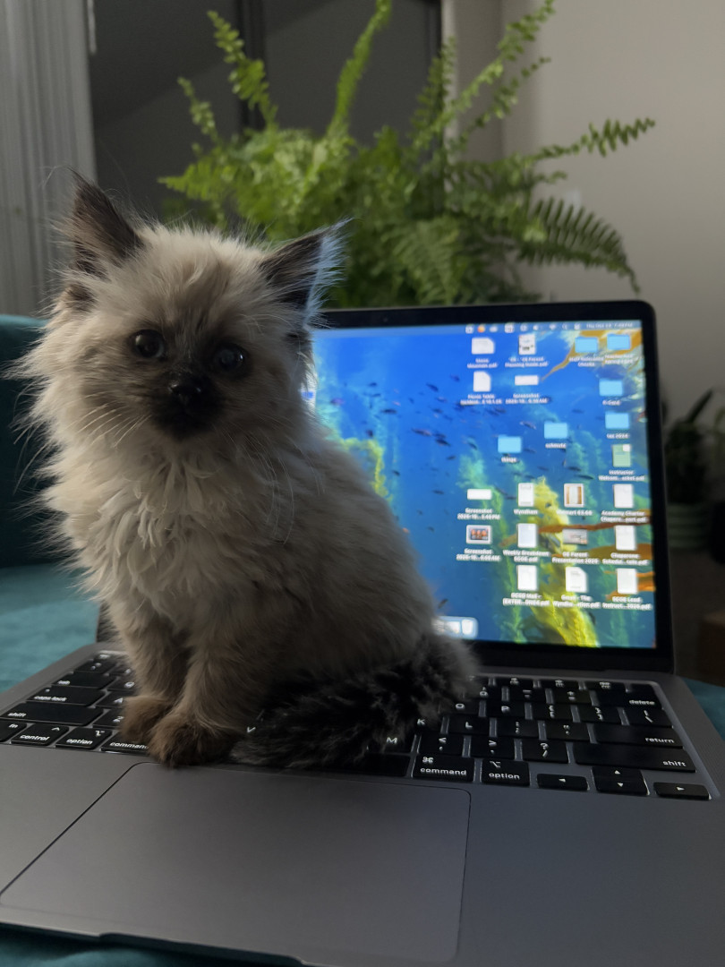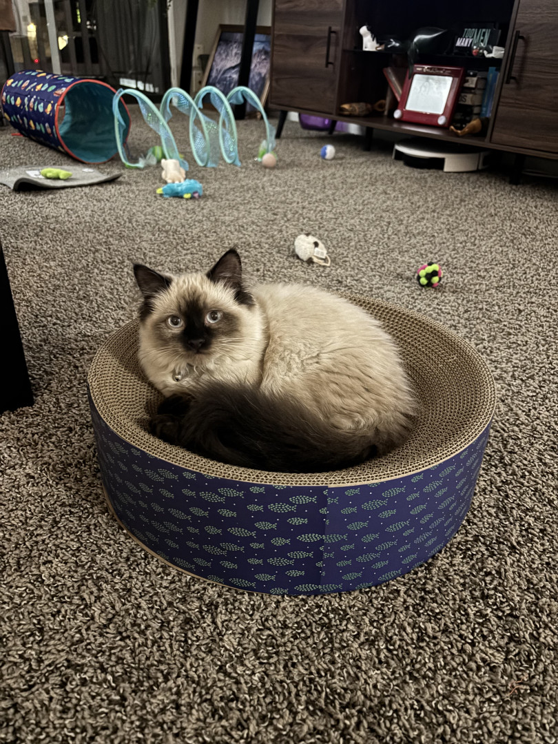 Mochi's most unique quality is how easily entertained she is. She seems to like straight lines and will track back and forth along where the carpet and laminate floor meet. She will also squish herself under the kitchen cabinets and run along the baseboards for no reason. She seems to enjoy it, until she is distracted by a toy in the distance and plays with that for a bit and then goes back to her lines.