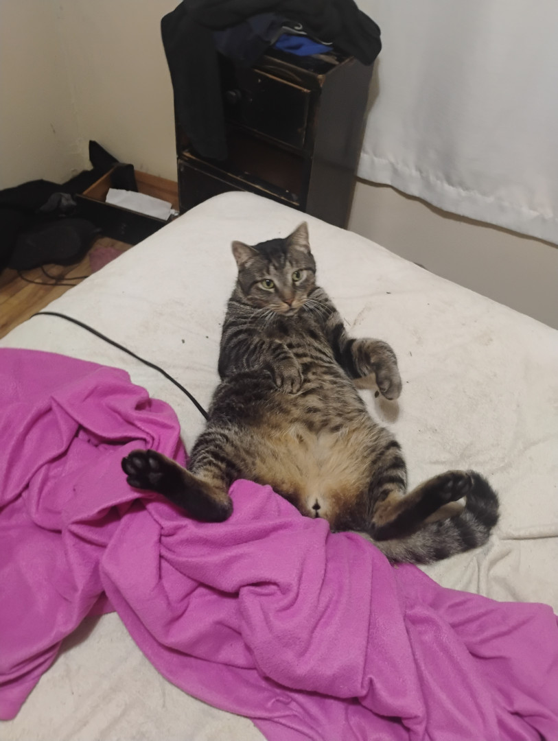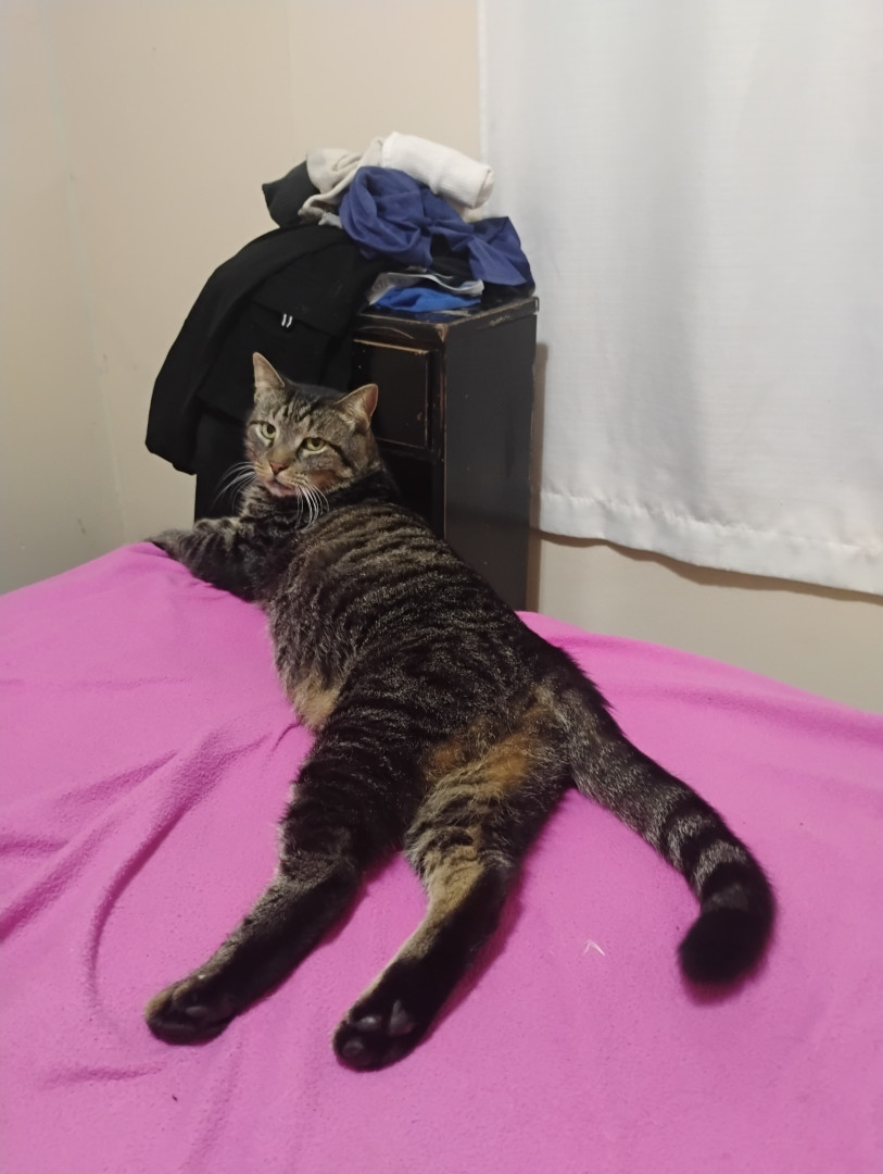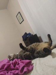 He's a love bug! Likes to go out during the day and sneak in at night to sleep next to me! And he likes to sleep all day!