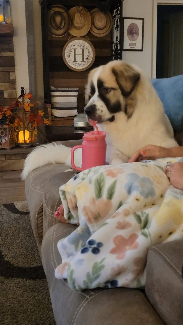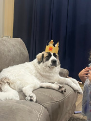 Molly loves everyone. Especially kids and other dogs. She protects her family , her " herd", which is her nature. She gives you her Pyrenees paw to let you know she wants attention. Lovable, gentle, protector.