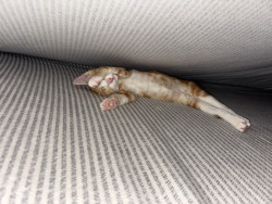 Molly has very playful antics. She bodies the essence of playful charm. She makes everybody smile with her gentle nature. She loves to purr and cuddle. She will ever so gently paw at my face when she’s laying on my chest or stick her arm through the stair rails to play. She loves walking feet going passed the bed when she’s underneath hiding.