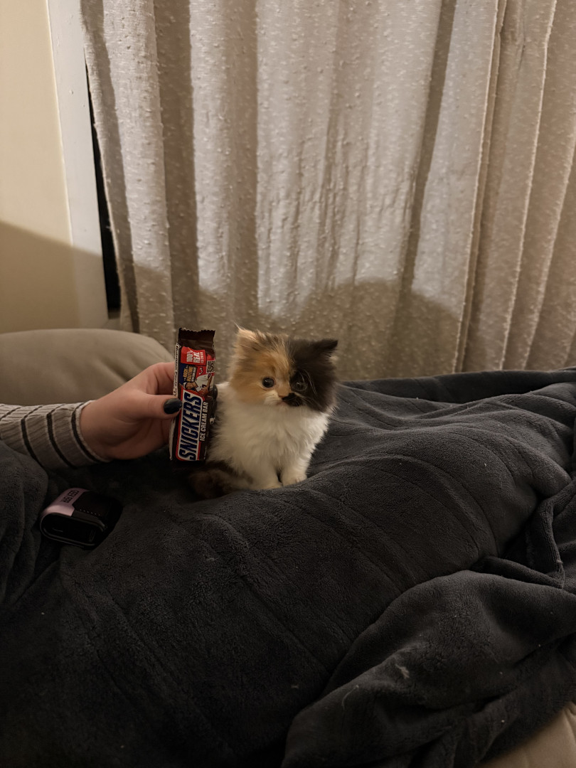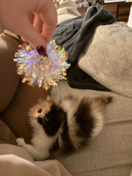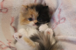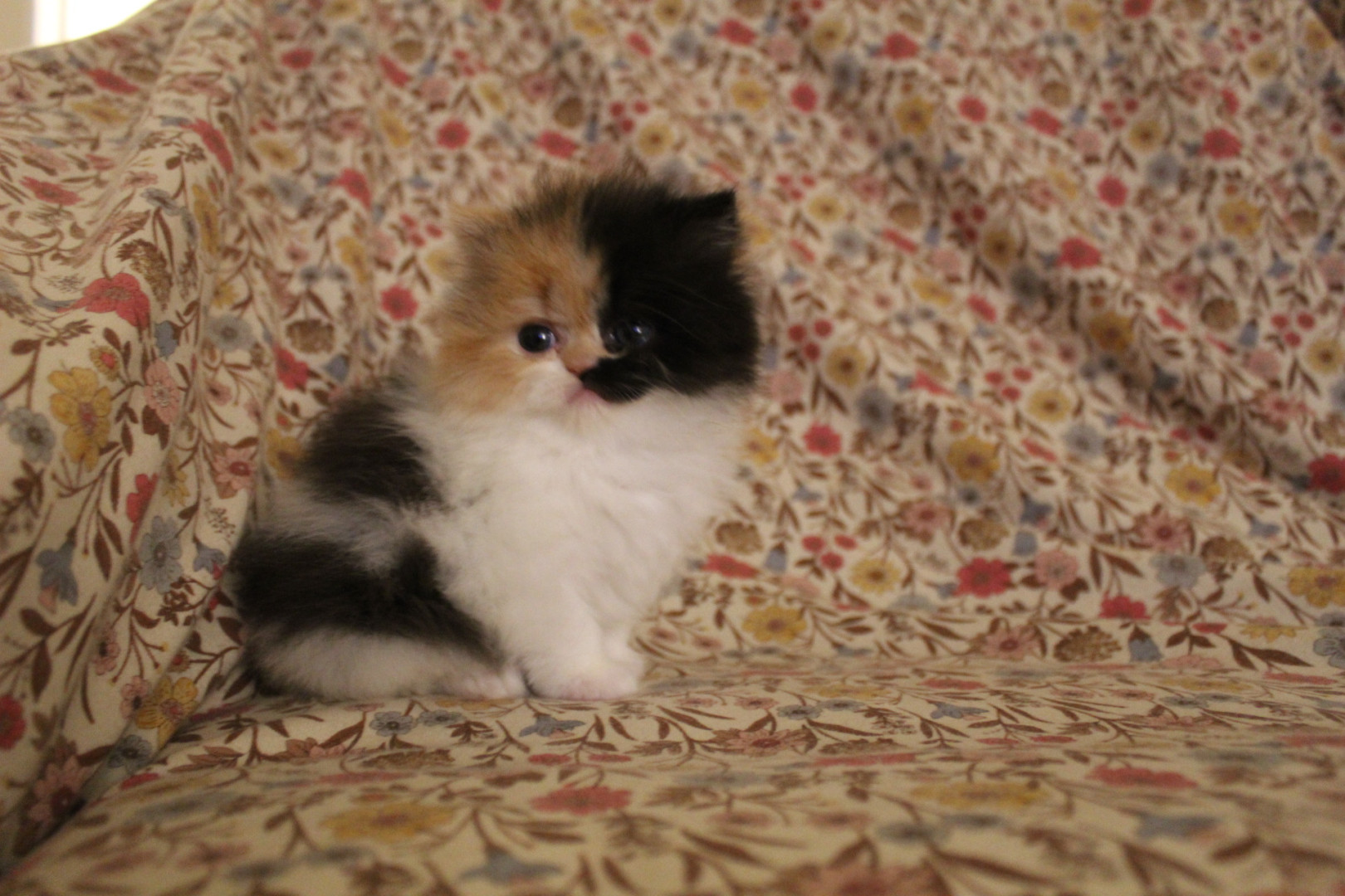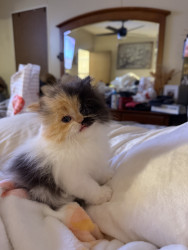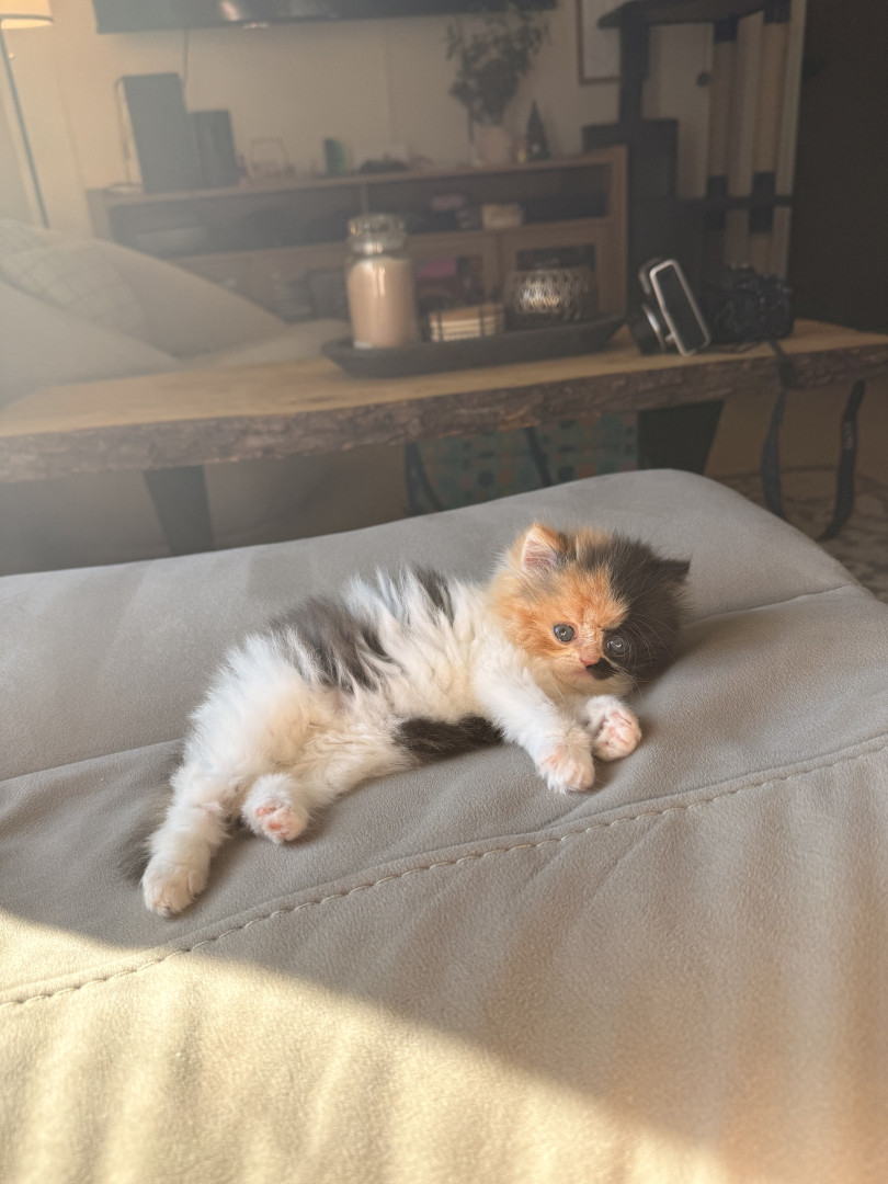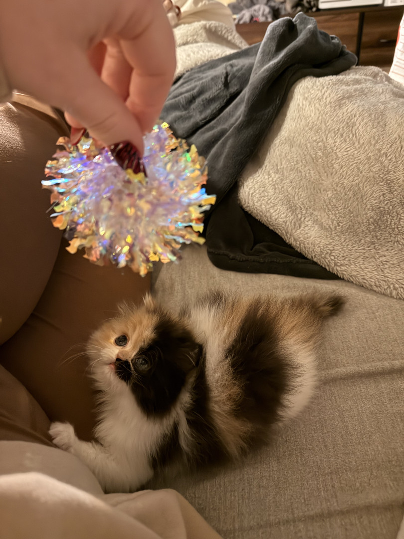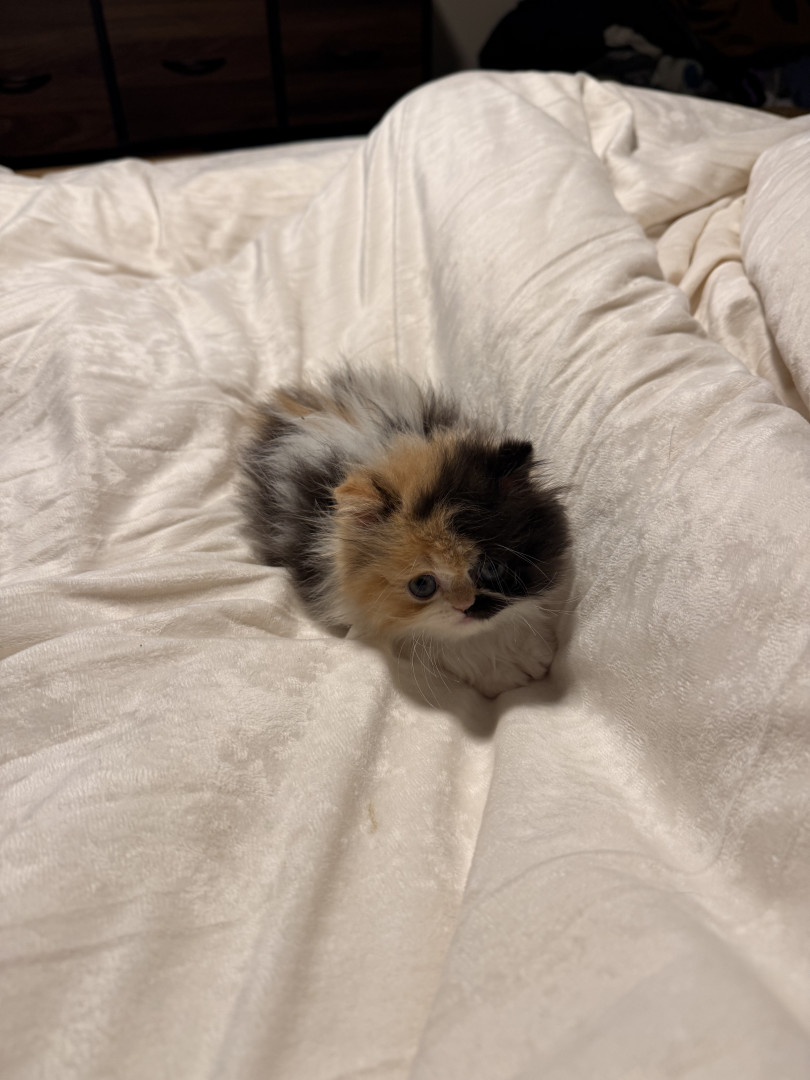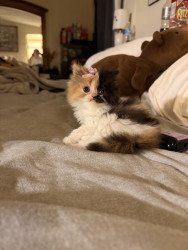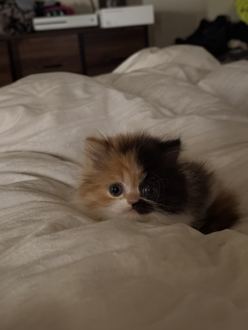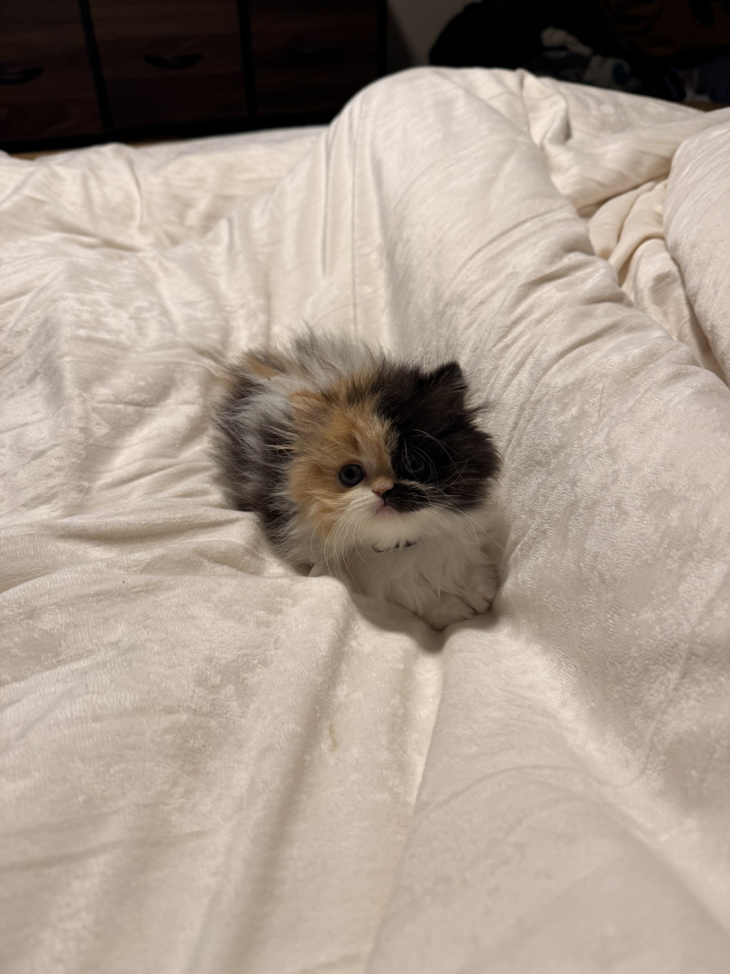 She is a Persian calico ball of fluff, she is only 8 weeks old but is very smart and playful