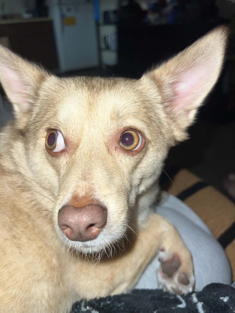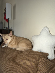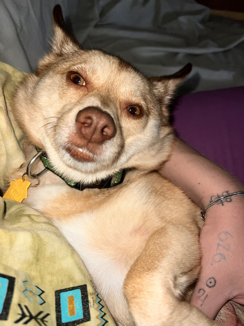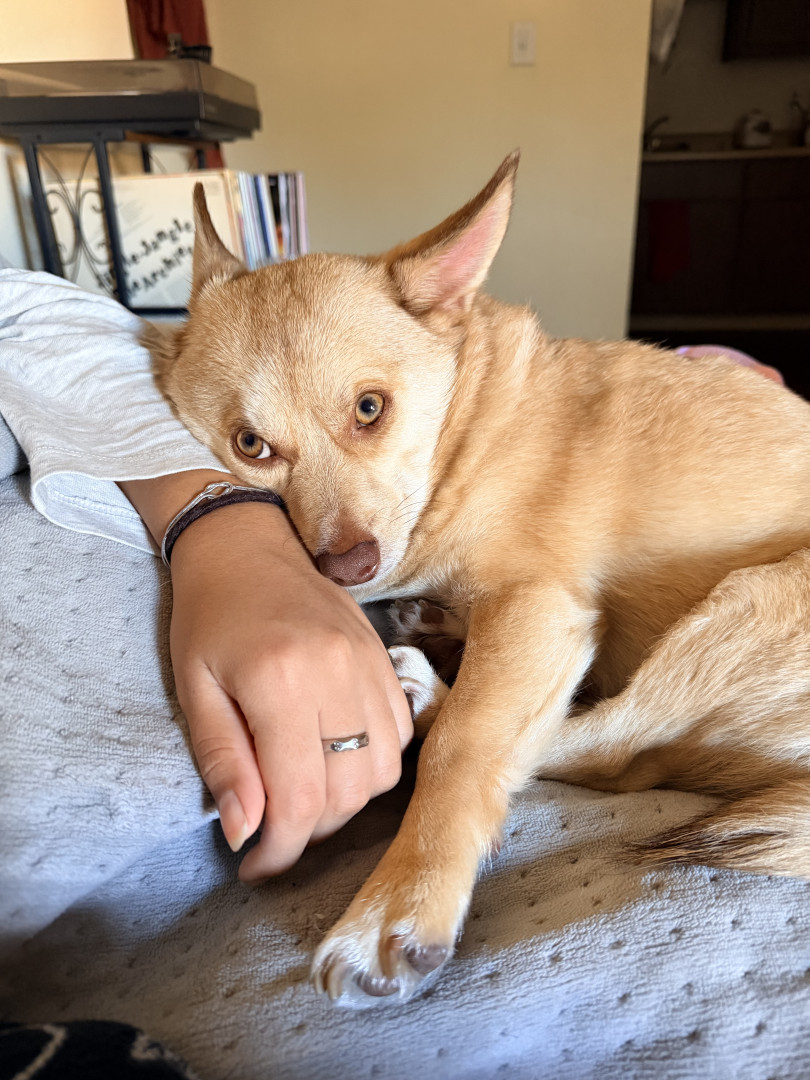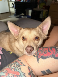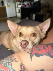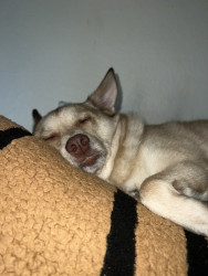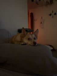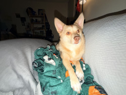 a sweet yet feisty chihuahua that only cares to be on a warm lap, under a warm blanket, eating any kind of snack, and getting love.