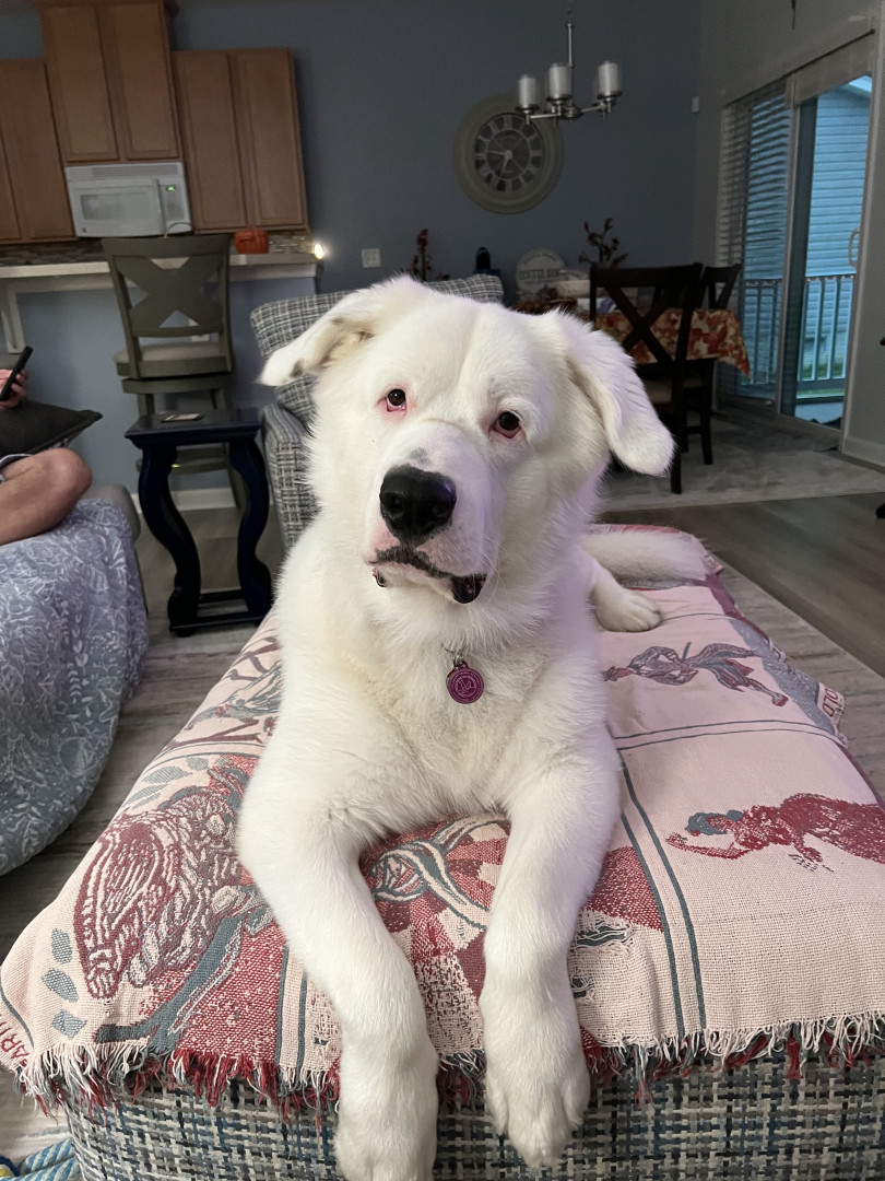 Moose is the kind of dog who just wants to play and then sleep on your feet. He gets along with other dogs or handlers when he goes to daycare. His is loving and just knows when you are having a bad day. When I get a migraine he will come into the bedroom quietly and lay down next to the bed and won’t leave until I’m feeling better.