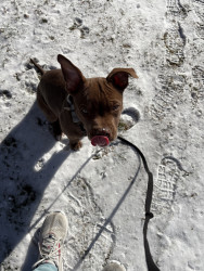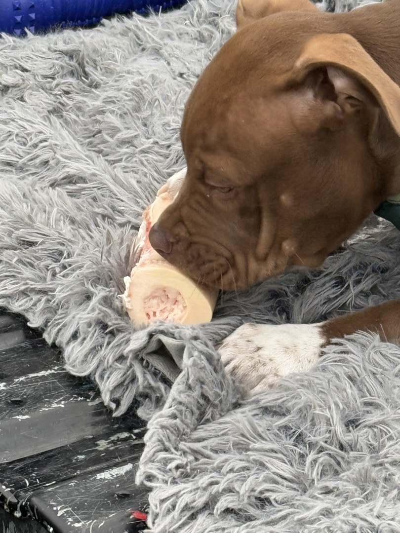 He should be Americans favorite because he’s a fun loving, curious puppy who loves to play. He gets along with all dogs and people and hasn’t met a sock he doesn’t like to chew on. He plays hard and naps hard too, one look at him and you can’t help but smile. When he looks at you with those big green eyes you wanna give him all the treats in the world.