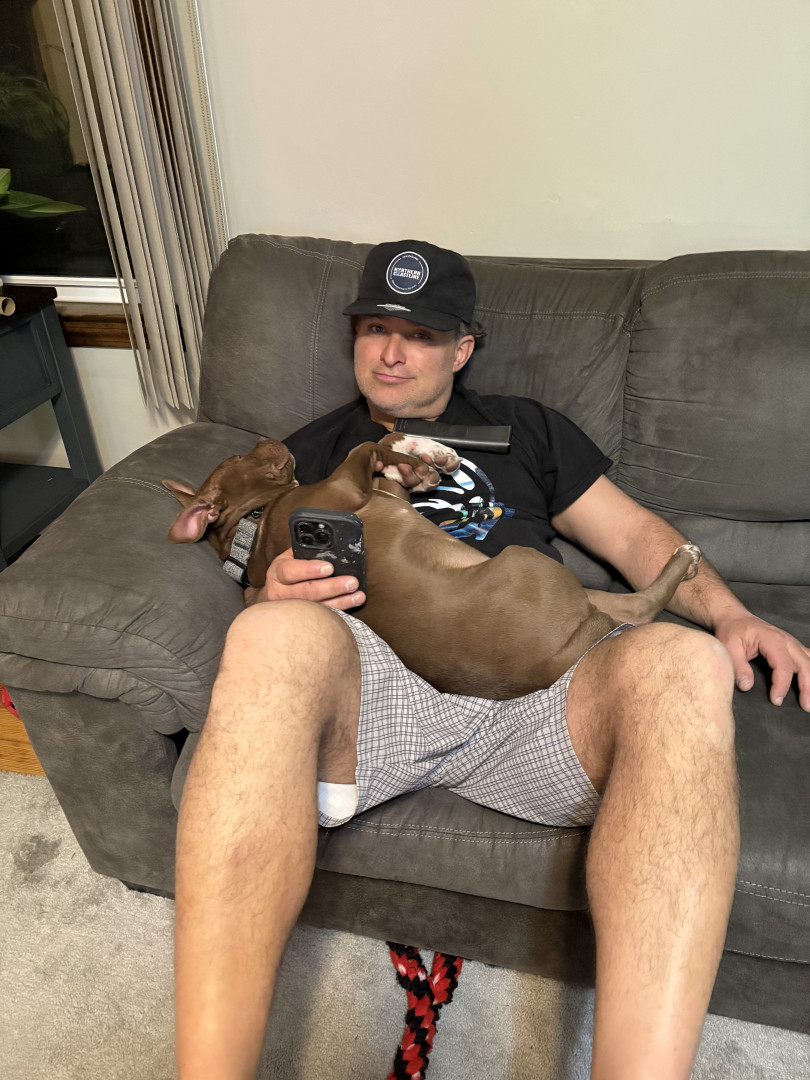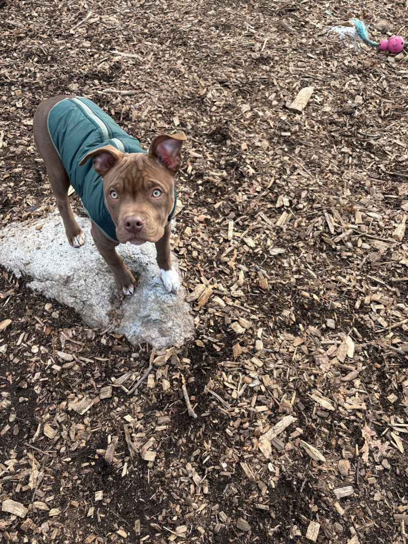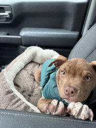 He’s a 3 month old American Bully who loves to play, sleep, eat and go to work with daddy for the day. He’s got an awesome personality