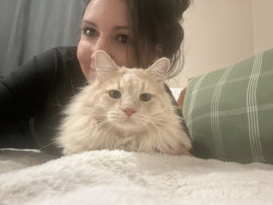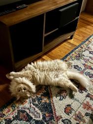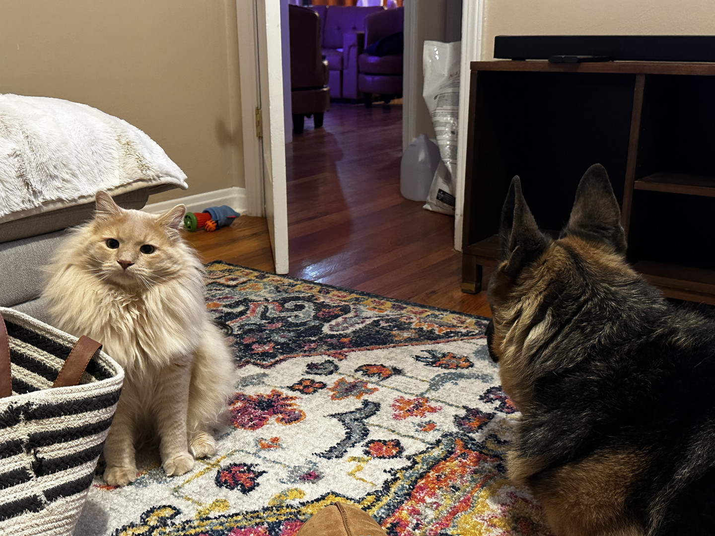He knows his name and struts like a mini-lion king, proudly chatting back when called. He loves game days on the couch and cozy naps with his German Shepherd best friend, Duchess.