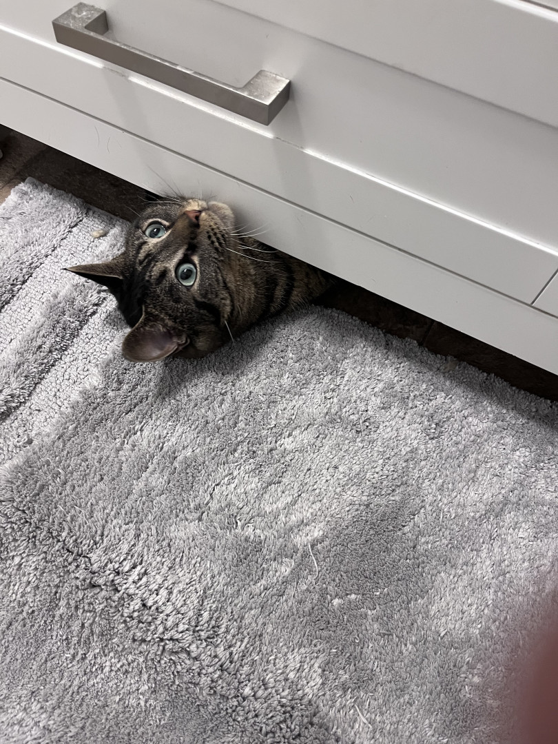 Mozzie is a cuddly cute and curious cat who will lounge anywhere… even under the bathroom sink!