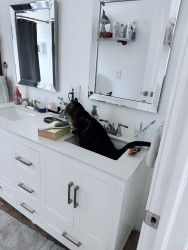 Mozzies most unique quality would have to be a tie between reading the emotions of his owner and also how he taught himself to pee in the bathroom sink…. (See pictures) Now if only he could teach himself to turn the water on and off to rinse it down! But hey, at least he has a cleaner litter box than most!