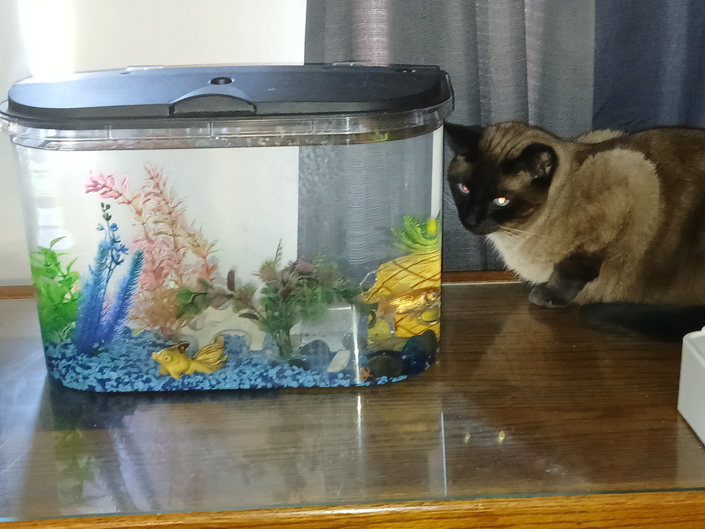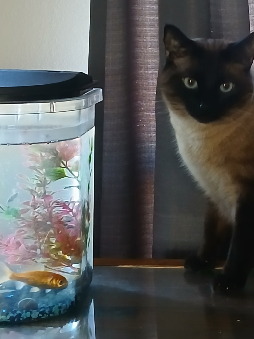 I would say that I have never met a cat more obsessed with a goldfish then this one. He also in the morning pulls the covers down and taps me on my cheek and screams at me like all Siamese do so that he can get breakfast. Sometimes it's 5:30 in the morning. But breakfast is at 7:00.