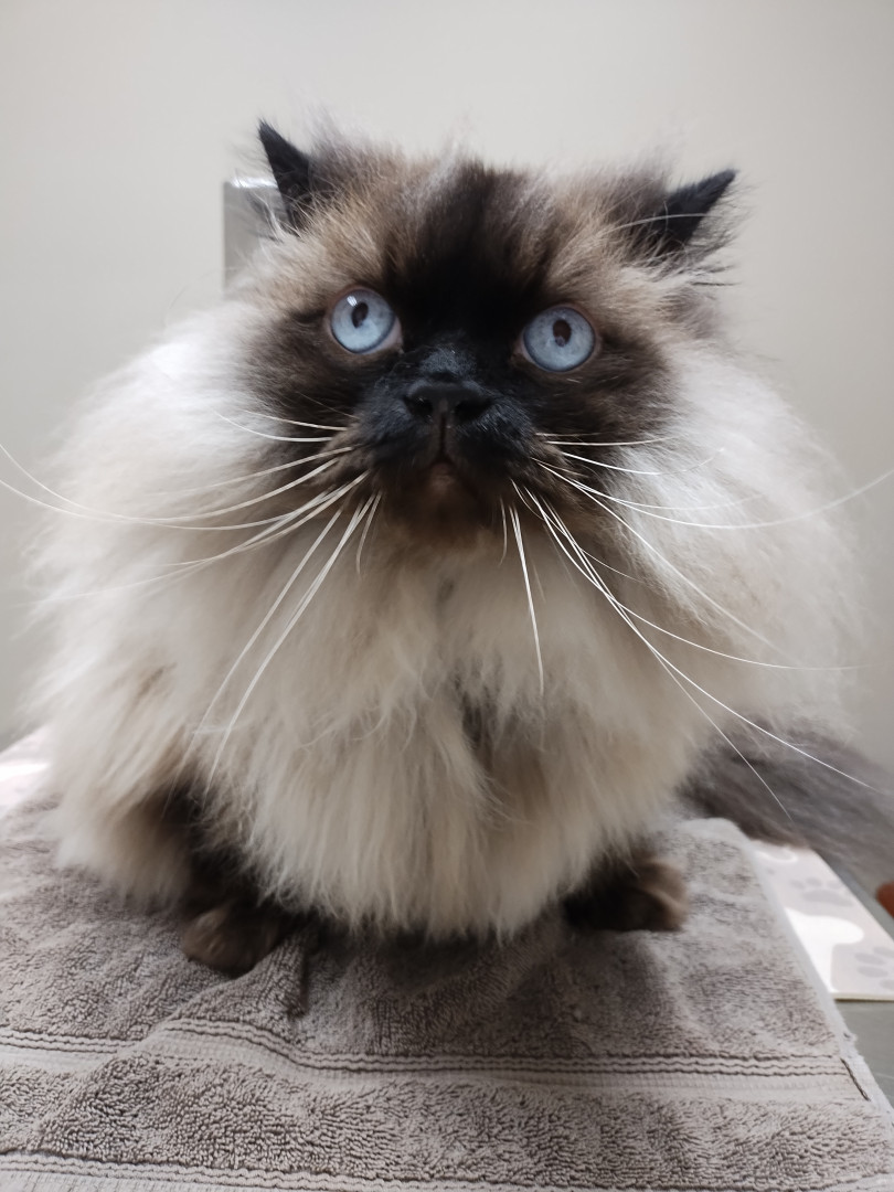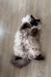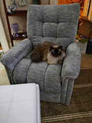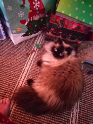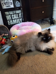 He craves attention and will let us know with his cute crackly meow. If you stop petting him and he isn't finished yet he will gently paw your arm to let you know he wants more. He also will start to drool when he is feeling very content and happy.