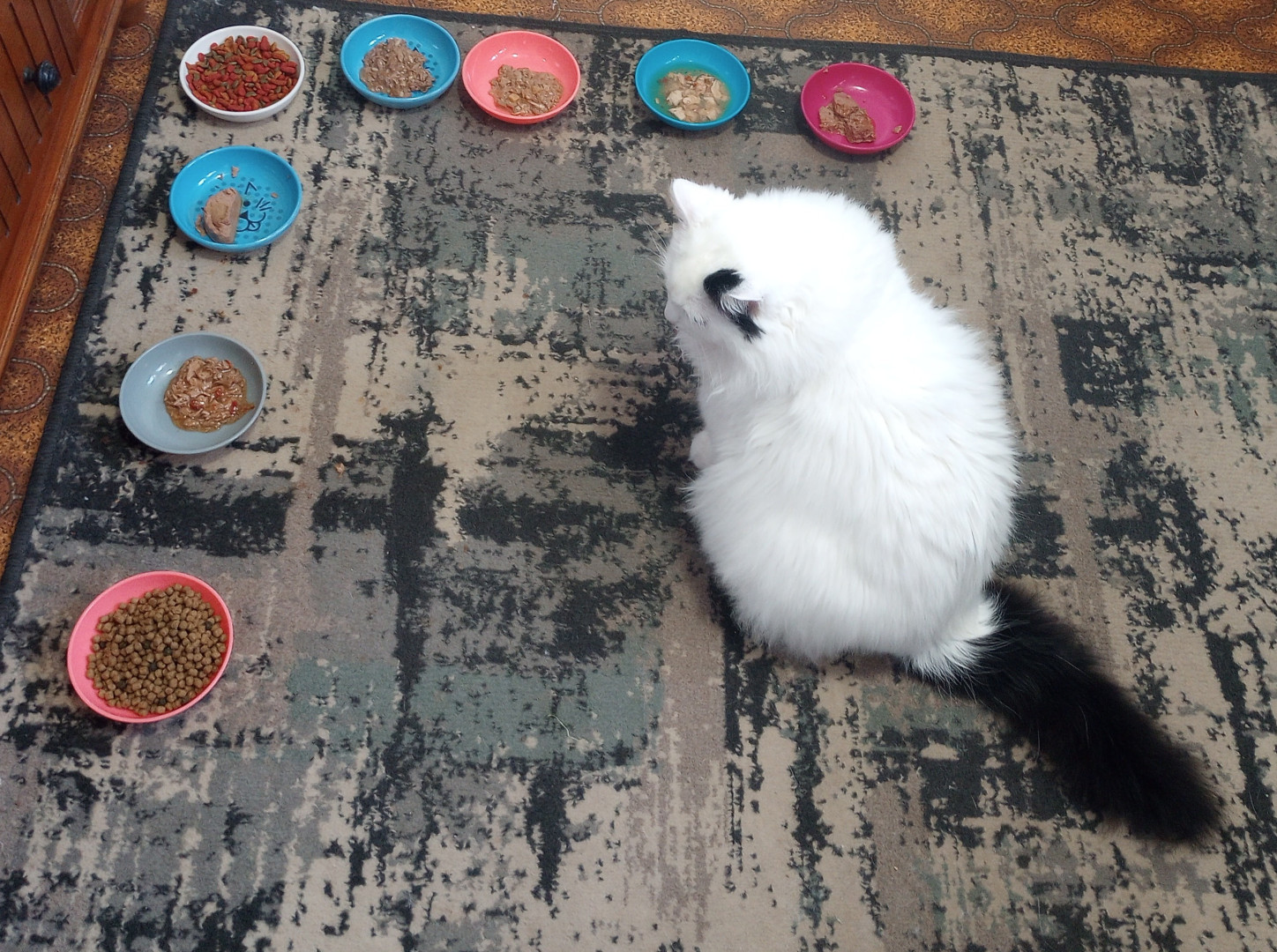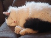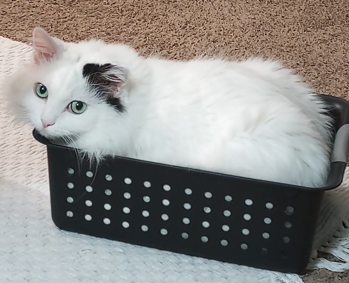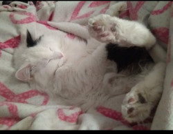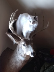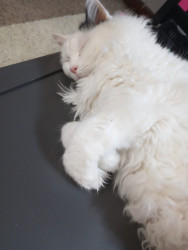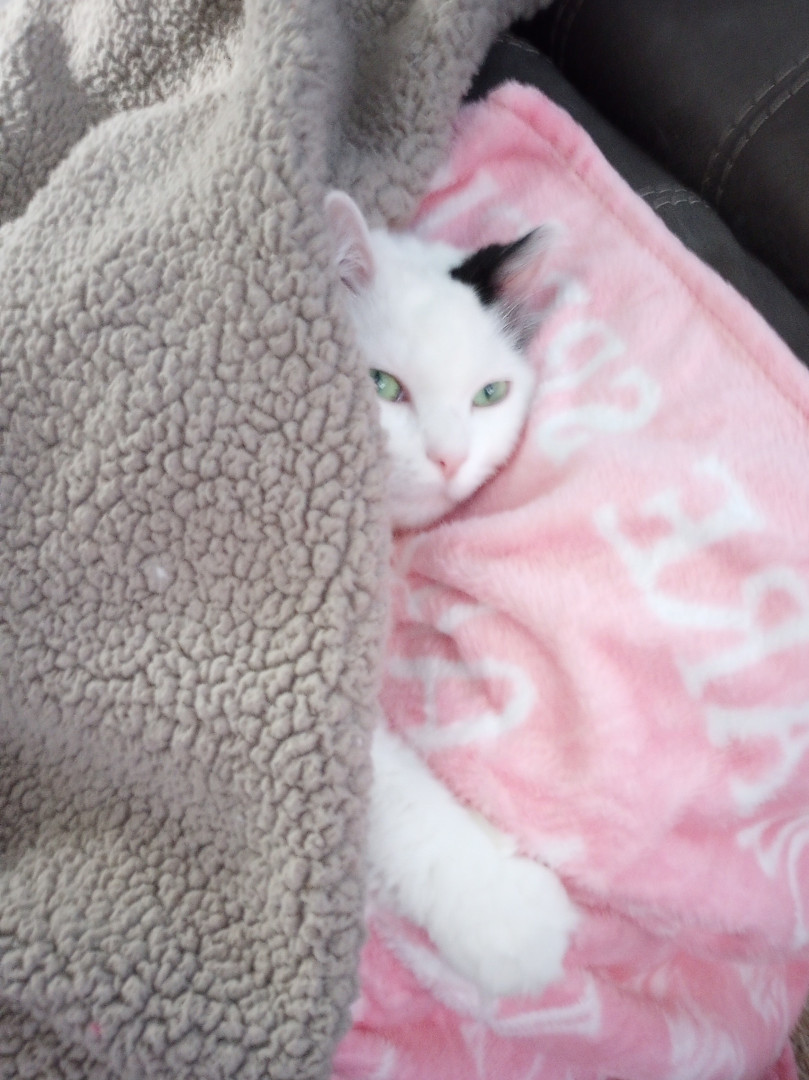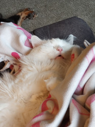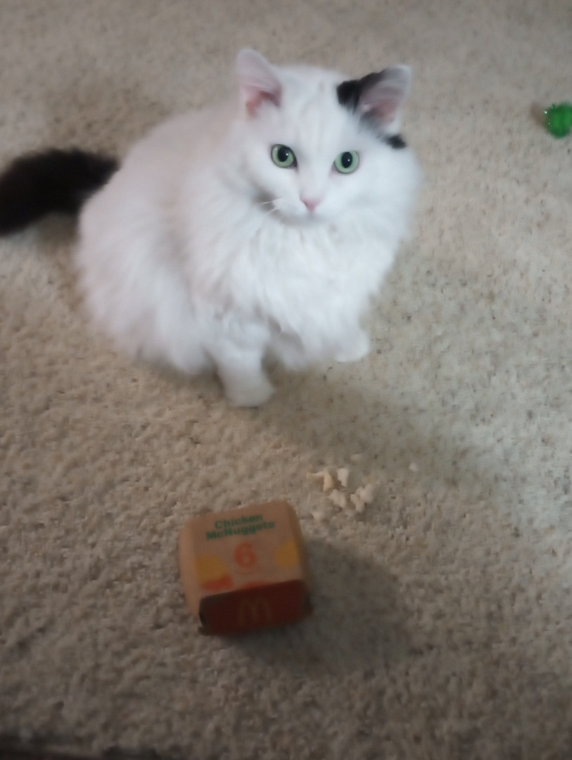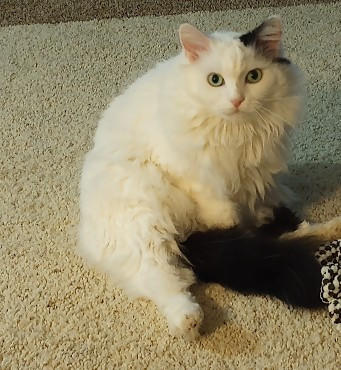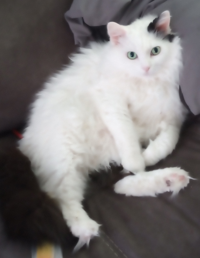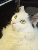Lilybears piercing green eyes, snowy white body with one dramatic black ear and black tail definitely makes her unique. Also she doesn't meow, she squeaks.