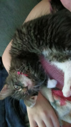 His journey has been rough we rescued him we found him in a Pepsi box by the dumpsters with a cut on his side that was infected we treated his wound it healed up and we saw the most trusting cat the most loving playful baby he could possibly be due to his circumstances.
