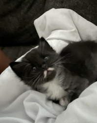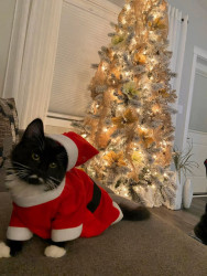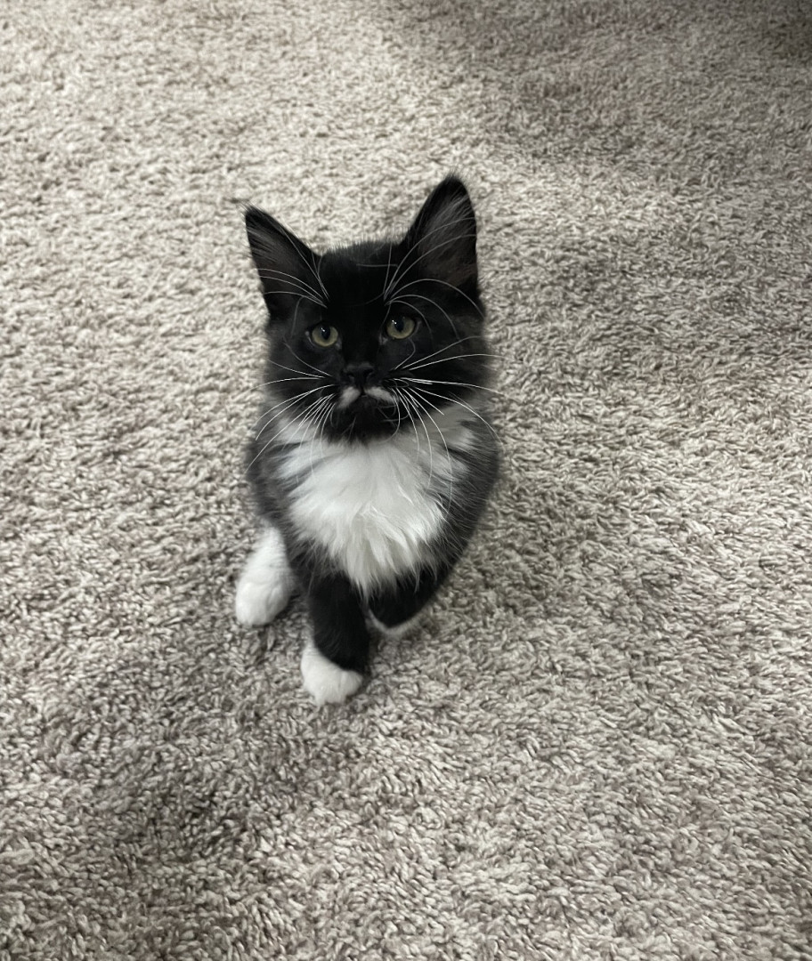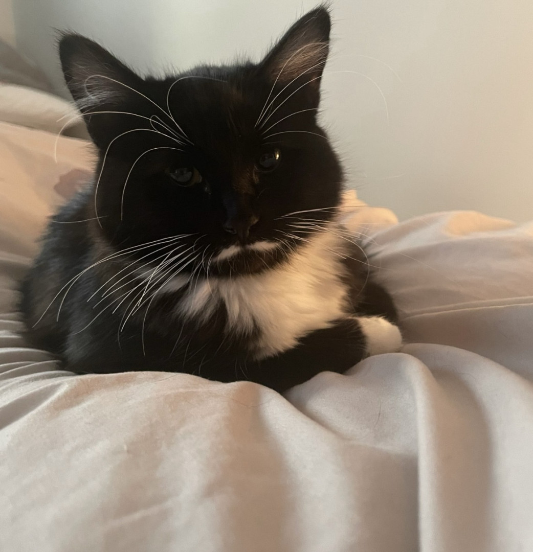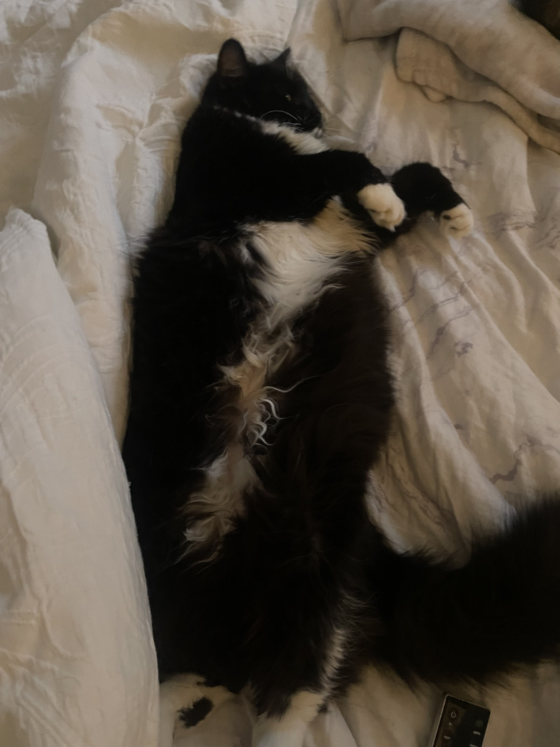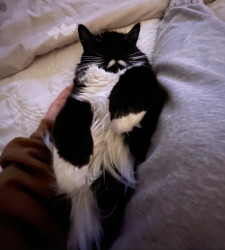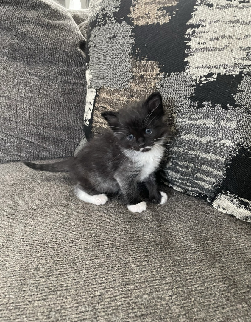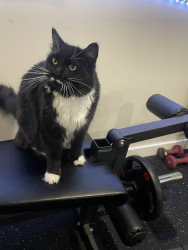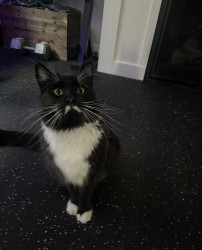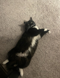Mussy is a tuxedo, long hair beautiful female with the most unique markings you will see. She is now approx 19 lbs of long hair beauty,