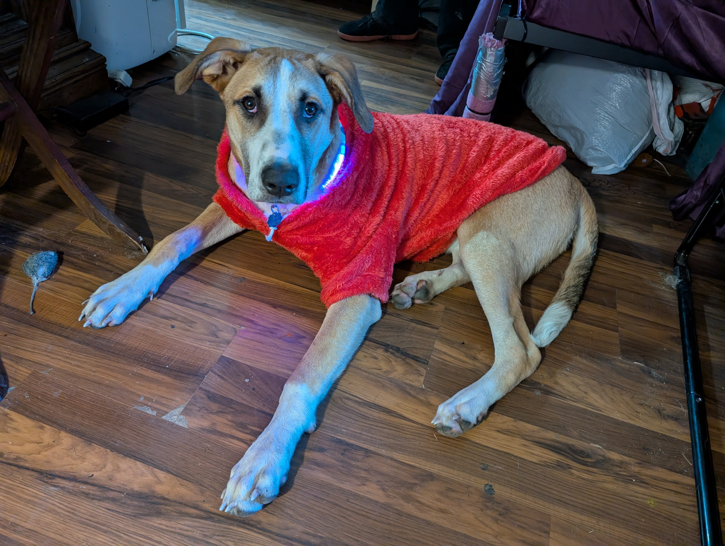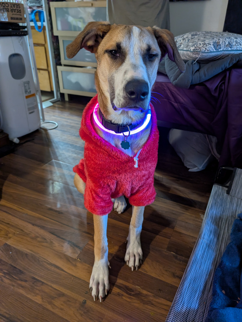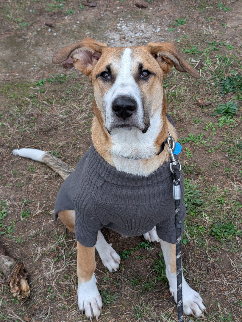Nacho is a 1 year old energetic sweet boy. He loves the park, cuddling, and wearing clothing. Likes playing with little dogs and loves cats.