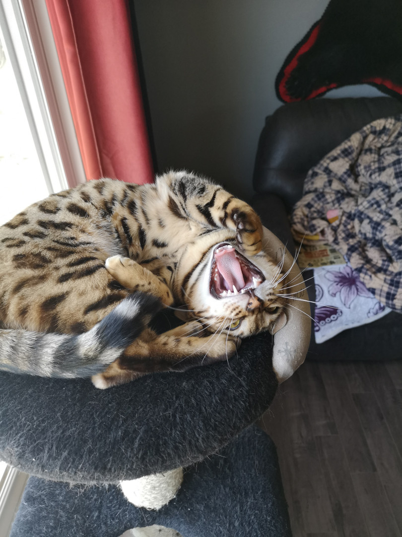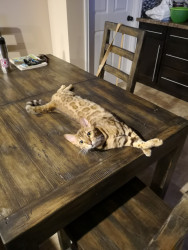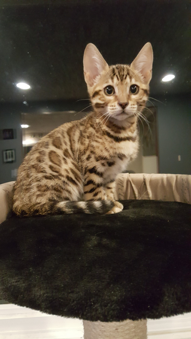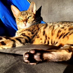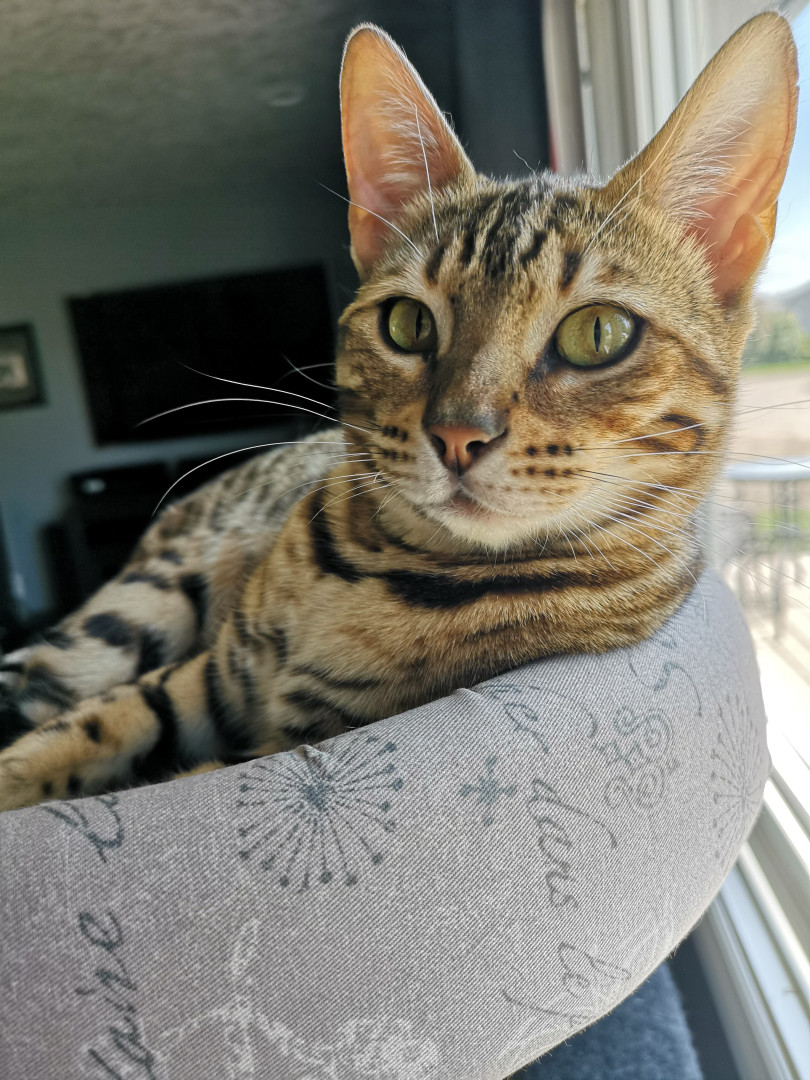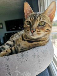 Nahla is an 8 lb "living room leopard" (bengal). Nahla is vocal, playful, cuddly, and believes rules do not apply to her.