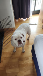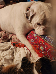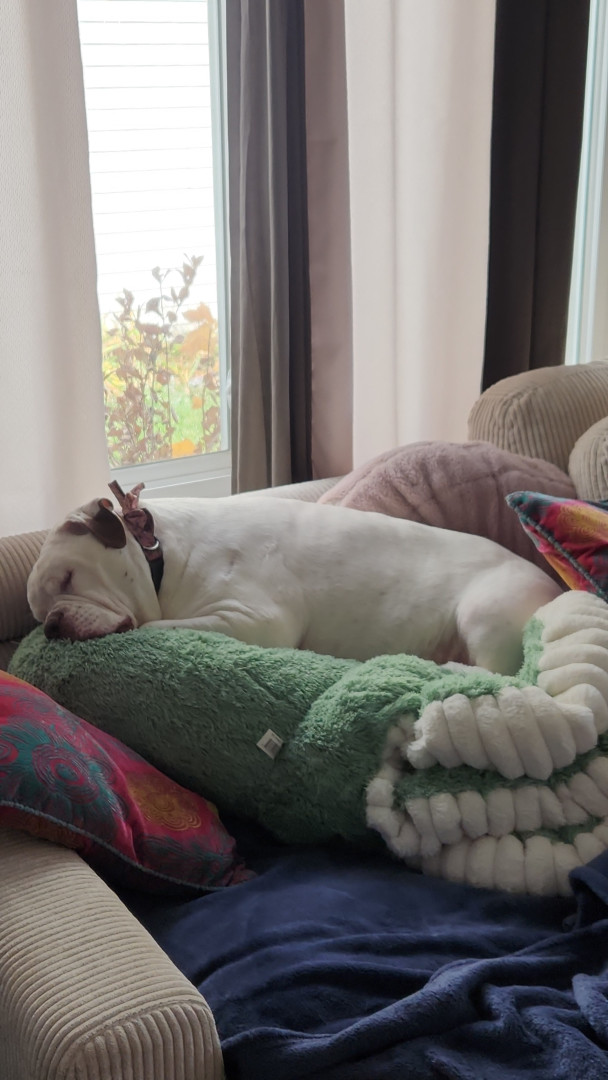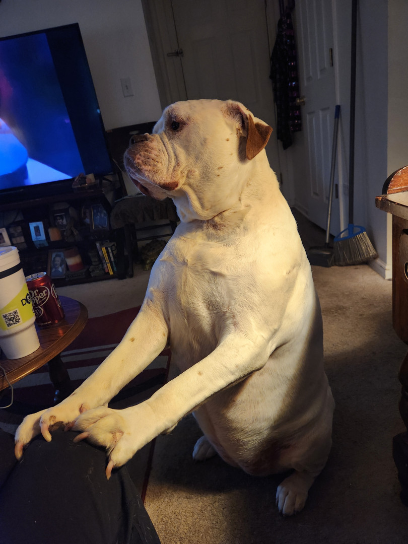 Shes the "dream" dog. At 105 pounds shes a ham. Loves everyone! She hates when I cry. And shes the best listener!!