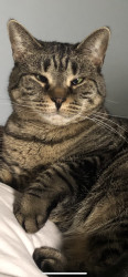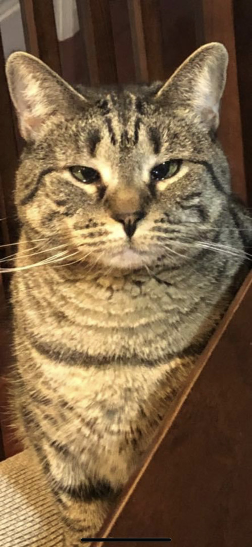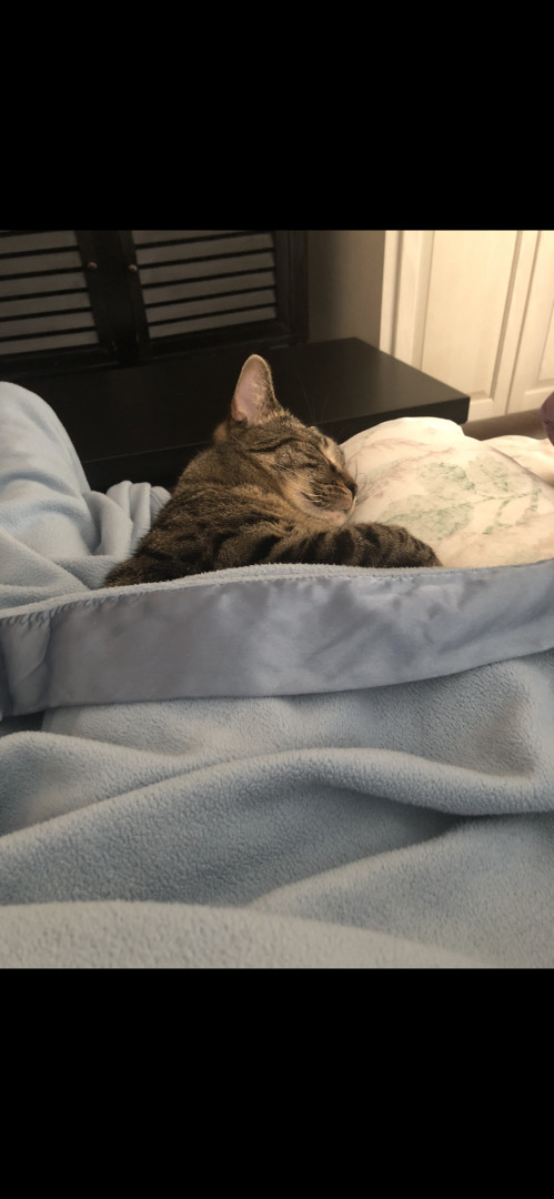 Nancy was a stray that showed up in a torrential rain storm and had 5 babies with us 4 weeks later! She’s the kindest, sweetest love muffin!