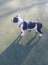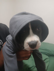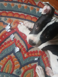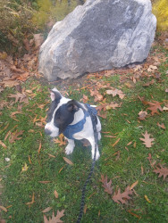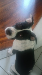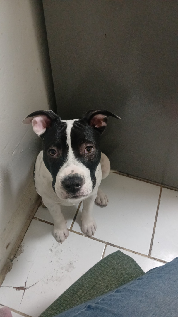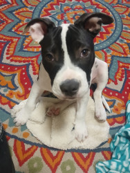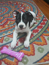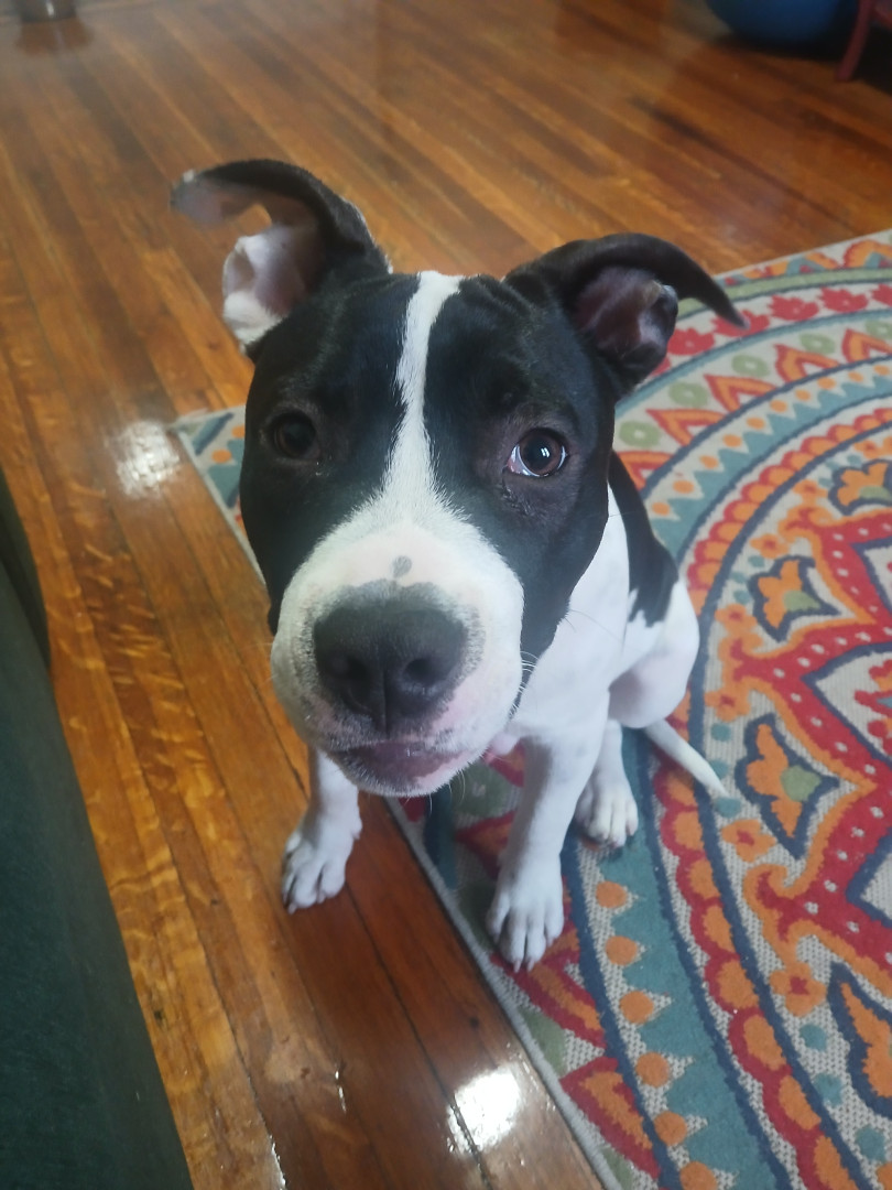 He is a charming, loving, super sweet playful doggy. Just one look at this Lil cow pitbull makes most people smile and want to pet him