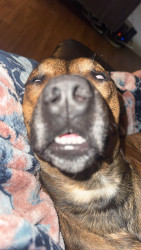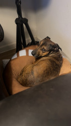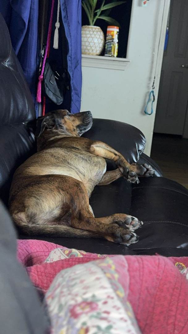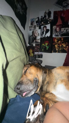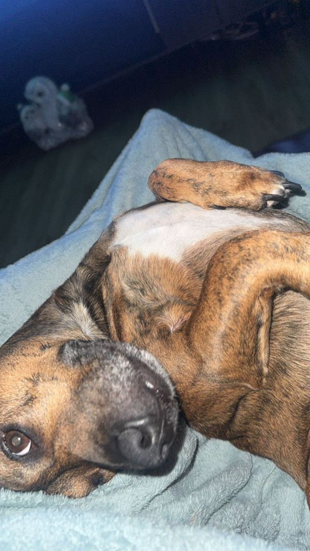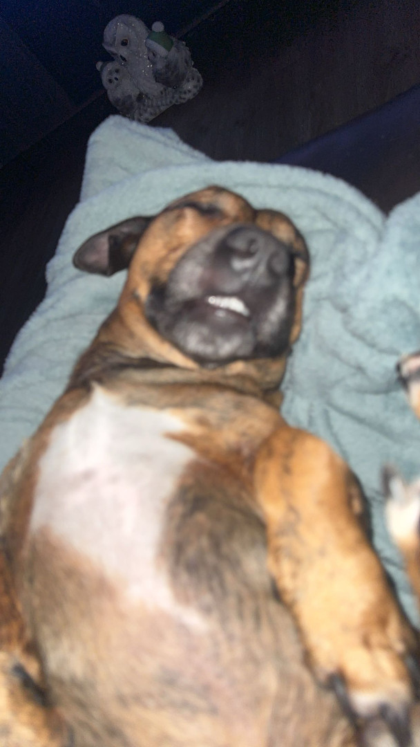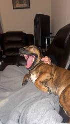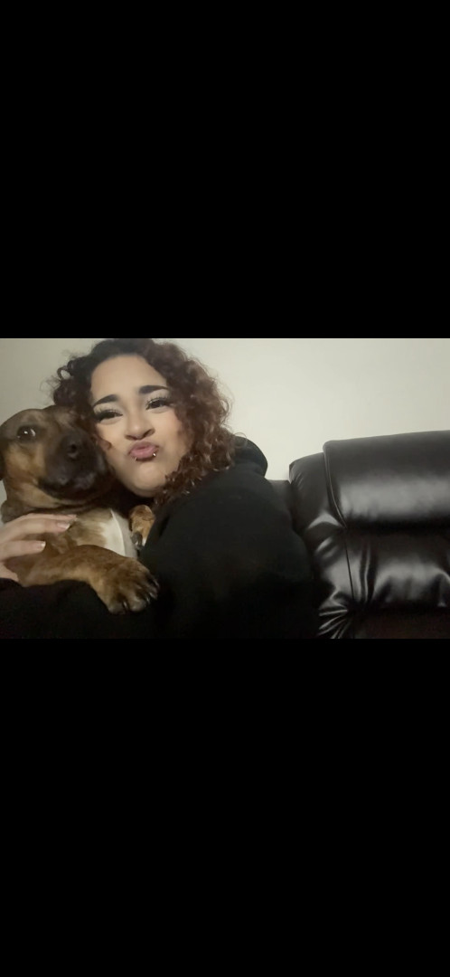 He is half pitbull and half weenie. He is very friendly and LOVES people, maybe a little too much. He is super hyper and just a good cuddle.