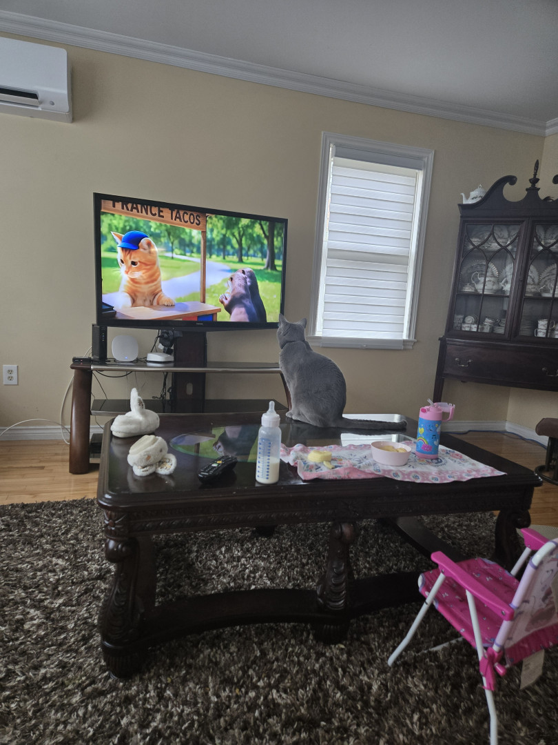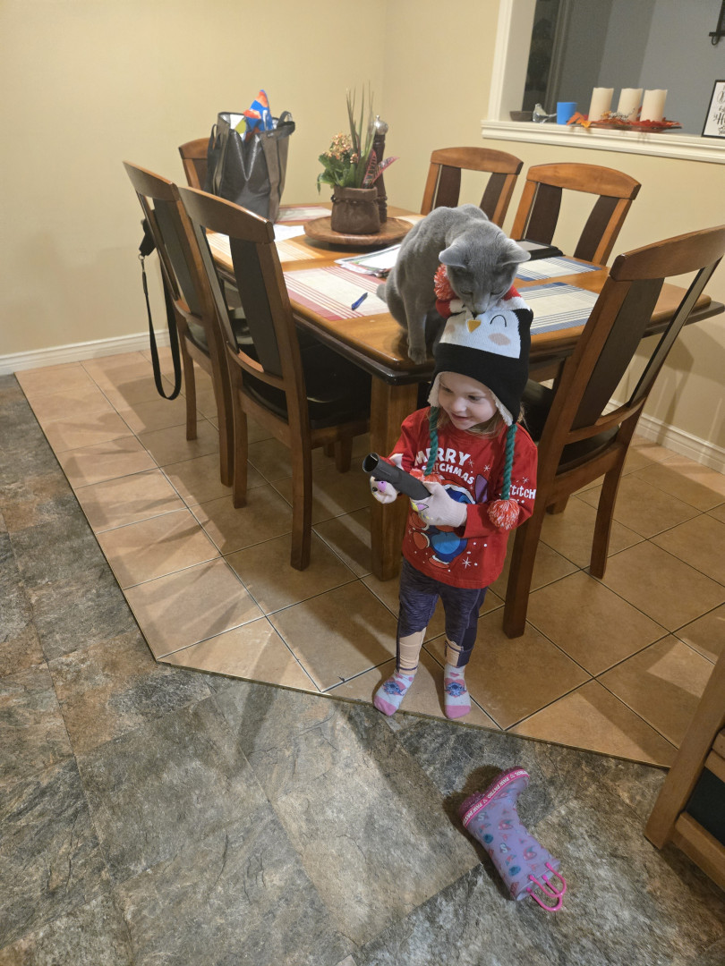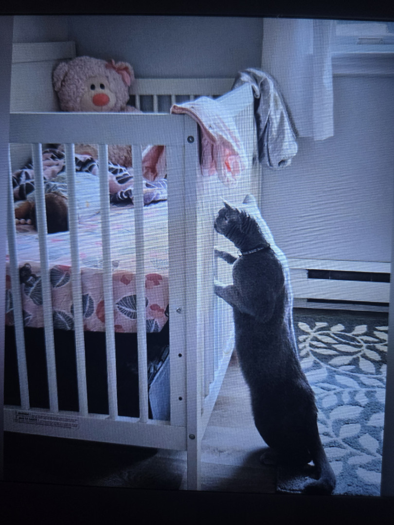 My grandaughter , Riley ,is 2 years 8 month old and ever since she was an infant Nicholi has watched out for her. He naps with her even when she was in a crib and checks on her when she is sleeping and when she is awake he is always in the room that she is in watching her closely. As she has gotten older they are basically inseparable. Nick is not a cat that likes to be picked up and cuddled so simple boops on the nose is sufficient for them to start their day together!!