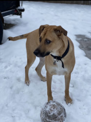 This is Nico and he is a Black Mouth Cur. He is the sweetest boy. He loves his cat brother and sisters and loves playing in the snow.