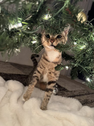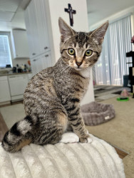 She’s full of charm, beauty, and personality! Her striking white triangle, swirly tabby stripes, and bright green eyes makes her unforgettable, and her playful, curious nature will steal everyone’s heart!