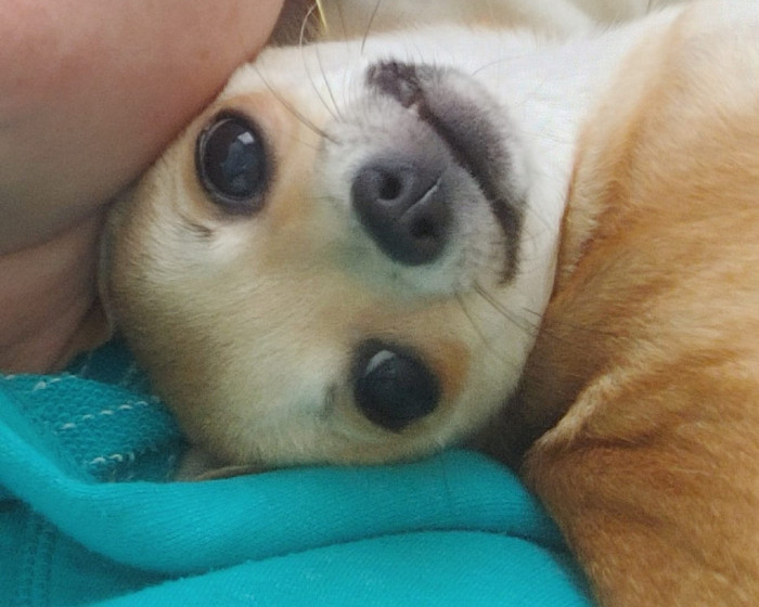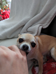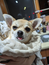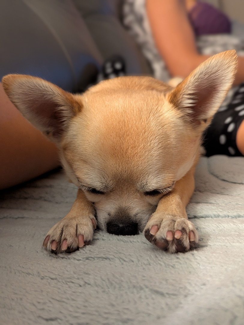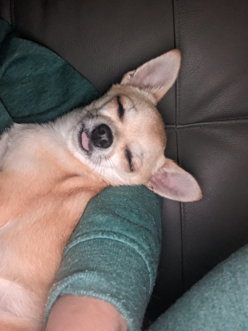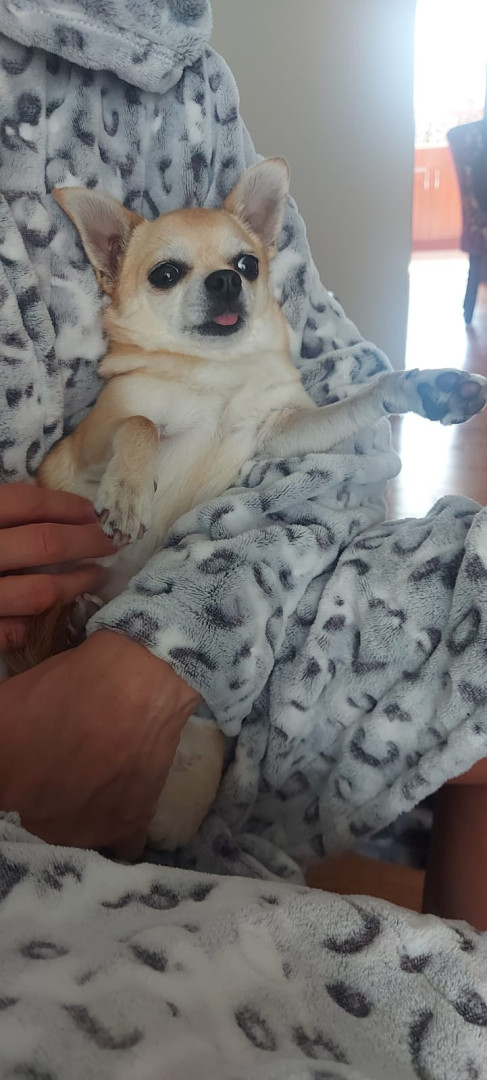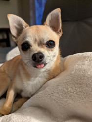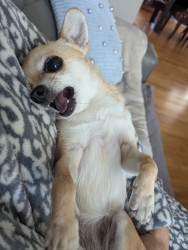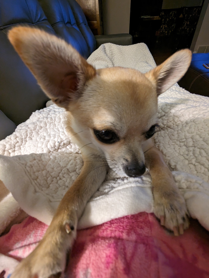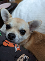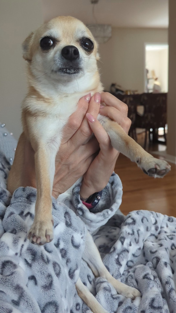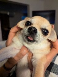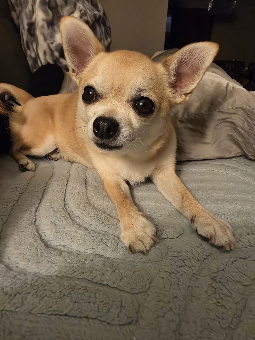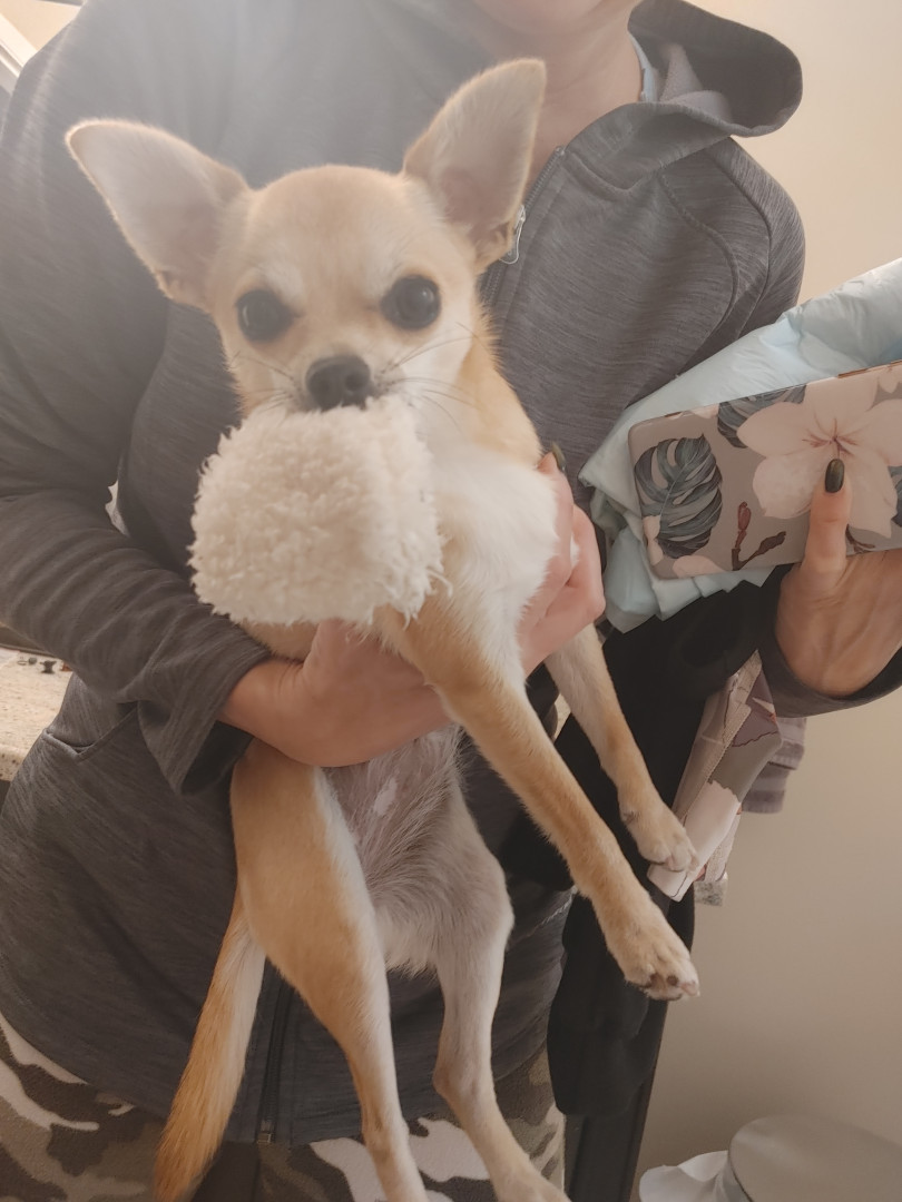 Noodle is the funniest little clown who is an absolute runt of the litter. She loves attention. She is a tiny Chihuahua with a big heart.