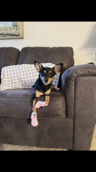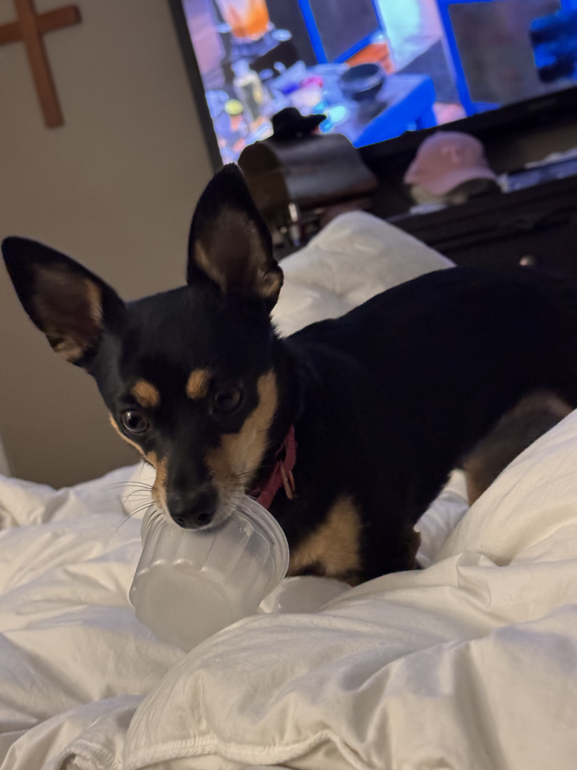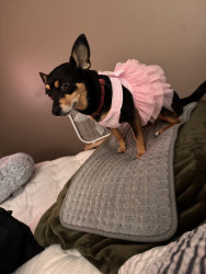 Any toy that’s smaller than her. She likes chicken jerky for a treat.