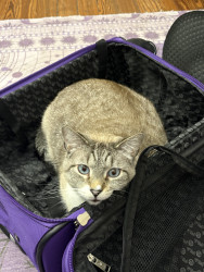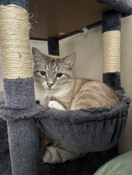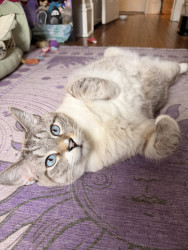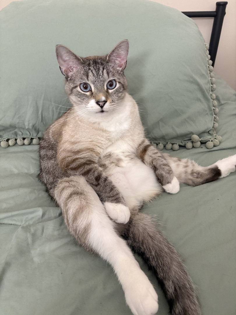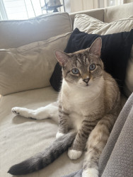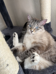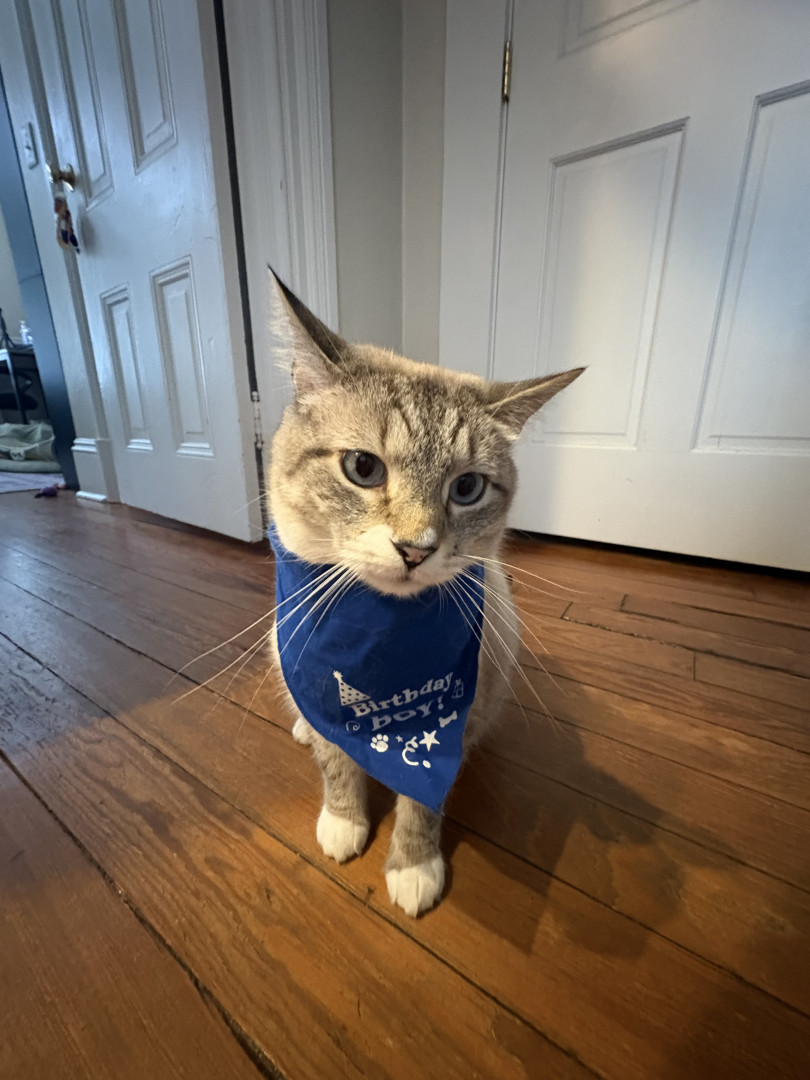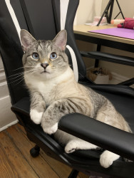 Receive Text UpdatesNube loves a hand-stitched catnip toy that one of his best friends (his auntie) made for him. He plays with it every day and has to cuddle it at night for bed. If the toy isn't near him, he will cry and make his mom search for it. Nube LOVES chicken Purr Pops from the brand Bonkers. He has one every day after dinner as a treat before bedtime, and he has to have one at exactly 9 pm every night. He even waits in front of the pantry door for it like a good gentleman.