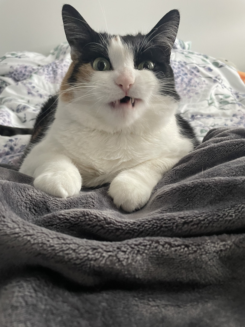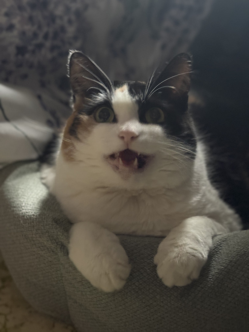 Nubia is a sassy, talkative, opinionated calico with a big personality to match her size. She’s a service cat and beloved pet!