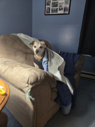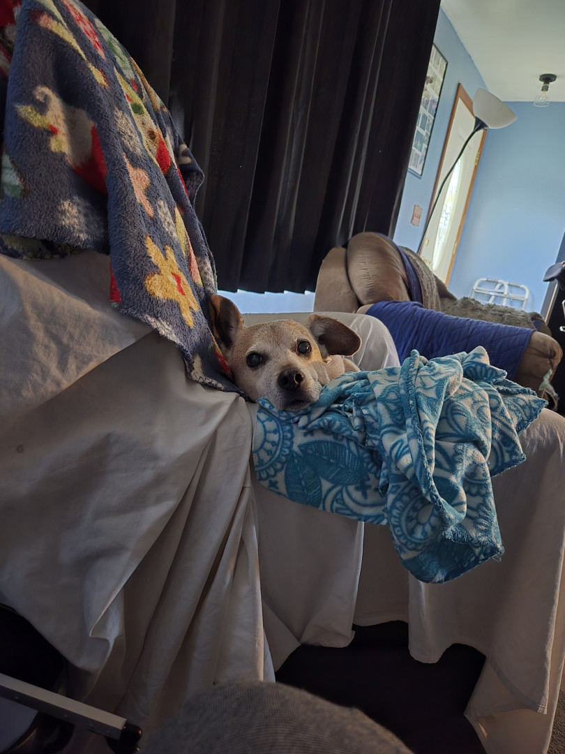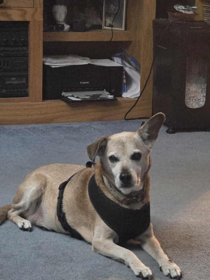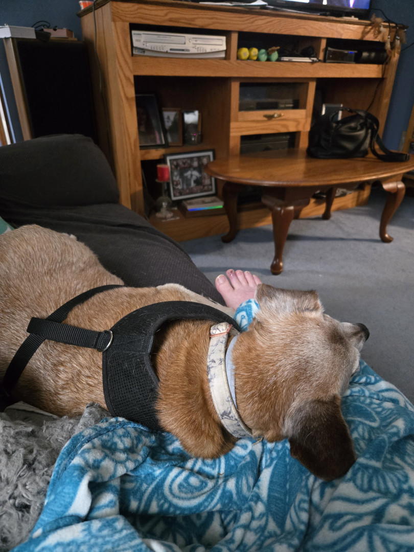 He was a rescue dog a long time ago. I am, I think his third and last parent. He has a heart condition and a tumor on his left back hip that's about the size of a grapefruit. He still keeps on going and is the best company since becoming a widow. He is my shadow at all time. Even when sleeping.
