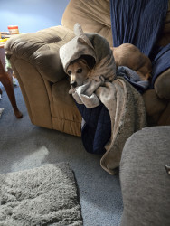 Nugget is a 16 or old character. He likes to cuddle, hide under the chair covers and throw every pillow on the couch on the floor. He loves