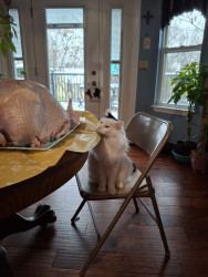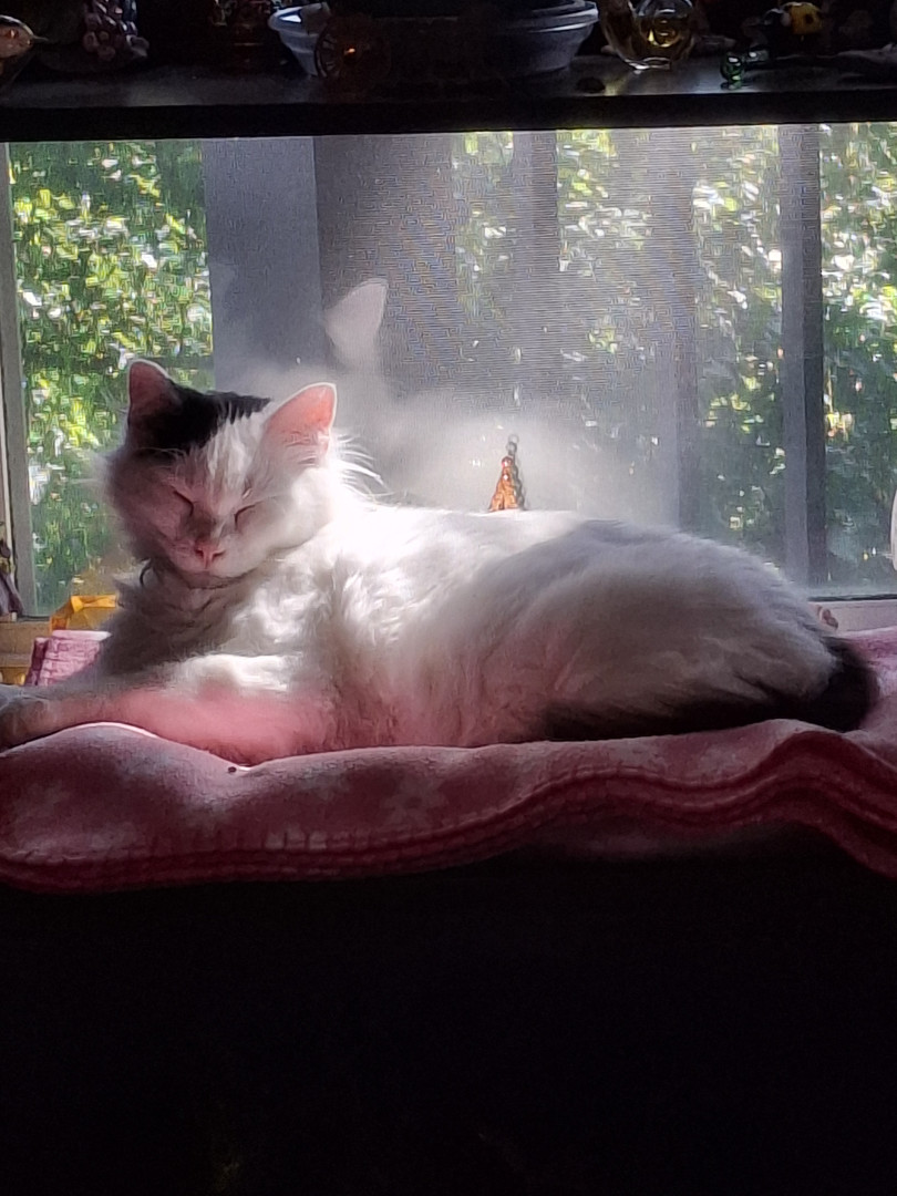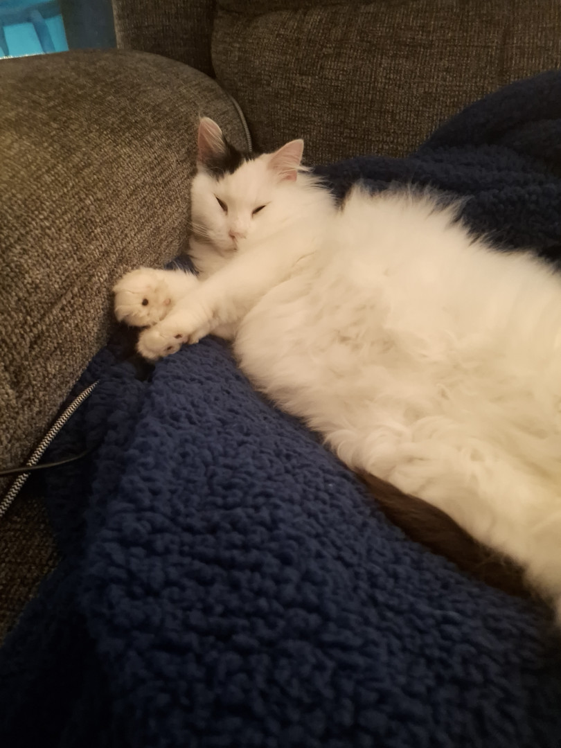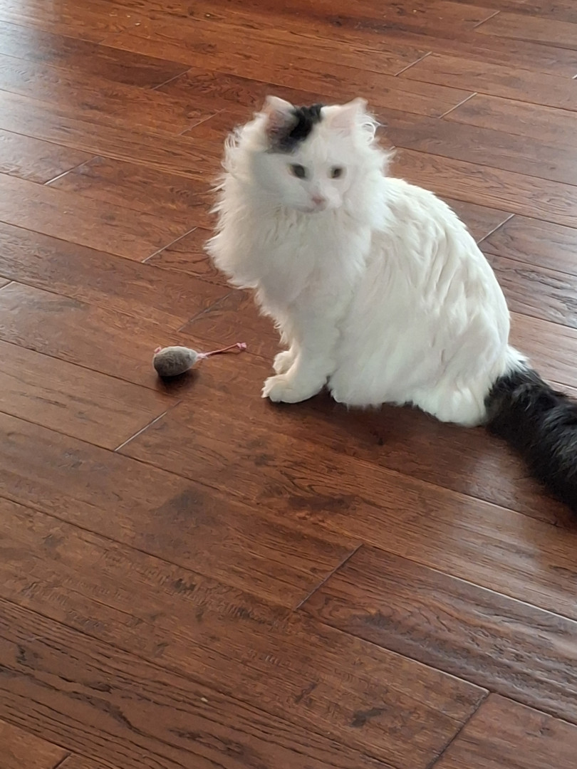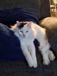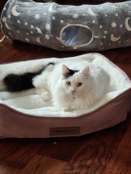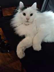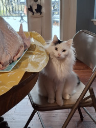 Nutterbutter is part Maine coon, she is a little over a year old. She has beautiful white fur and her fur is as soft as velvet!