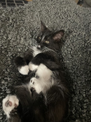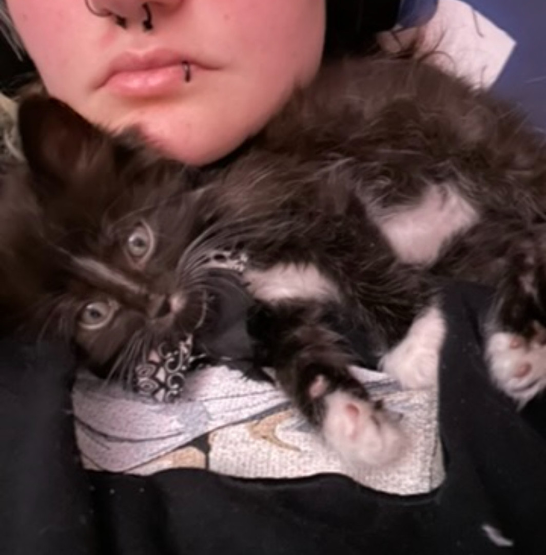 Nyxie is a very energetic, chaotic cat. She’s always playing, and when she’s not, she’s cuddling with you and suckling on a blanket.